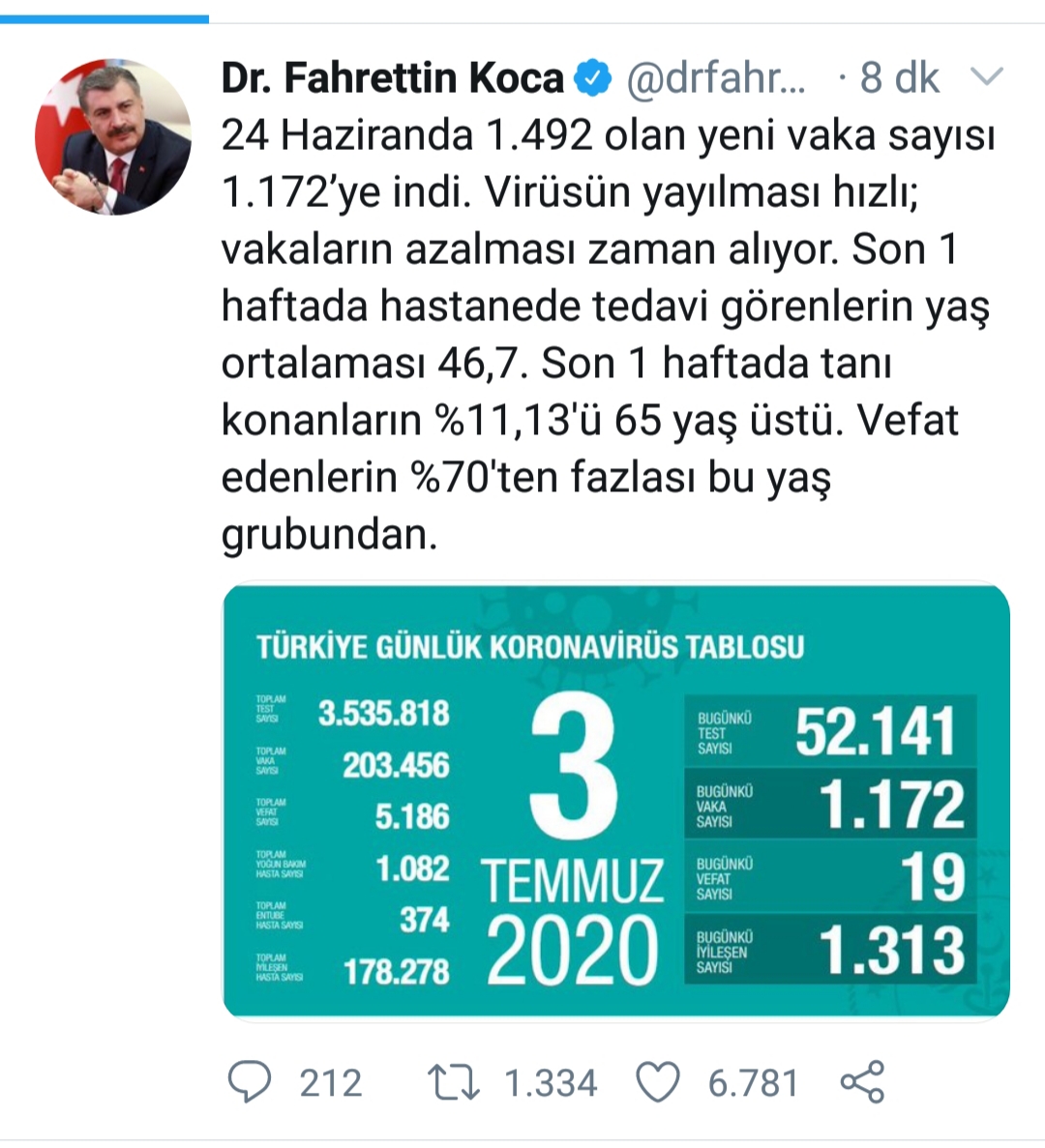 3 Temmuz 2020 Türkiye'nin güncel koronavirüs verileri açıklandı.
