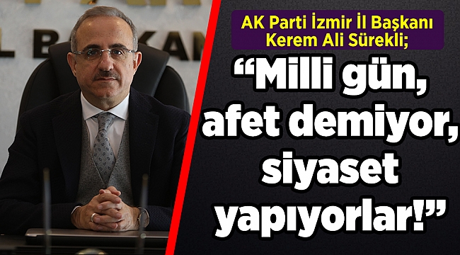 AK Parti İzmir İl Başkanı Kerem Ali Sürekli, İzmir’in 99. kurtuluş yıldönümü kutlamalarında iktidara yüklenen CHP İl Başkanı Deniz Yücel ve Büyükşehir Belediyesi Grup Başkan Vekili Mustafa Özuslu’nun konuşmalarına tepki gösterdi. CHP’nin milli gün ve bayramların ortak ruhunu bir kenara atıp, külliyen siyasi şov yaptıklarını söyleyen Sürekli; “Bunu hep yapıyorlar. Milli gün, maneviyat tanımıyor, siyaset yapıyorlar. Bahsettikleri şaşılık, asıl kendilerinin yaklaşımında. 9 Eylül gibi milli mücadelenin simgesi bir tarihin tek sahibi değiller. Bu tarih hepimizin, bu zaferler hepimizin onuru. Cumhuriyetin son 20 yılında ülkeye de İzmir’e de yaptığımız yatırımlar ortada.” diye konuştu.