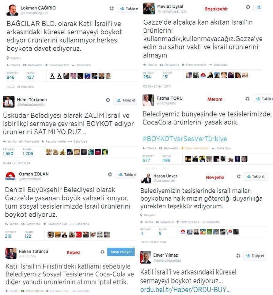 Şahinbey Belediye Başkanı Mehmet Tahmazoğlu da, twitterdan attığı mesajda, "Şahinbey Belediyemizin sosyal tesislerine ve sosyal marketimize İsrail mallarının girişi kesinlikle yasaktır" dedi.