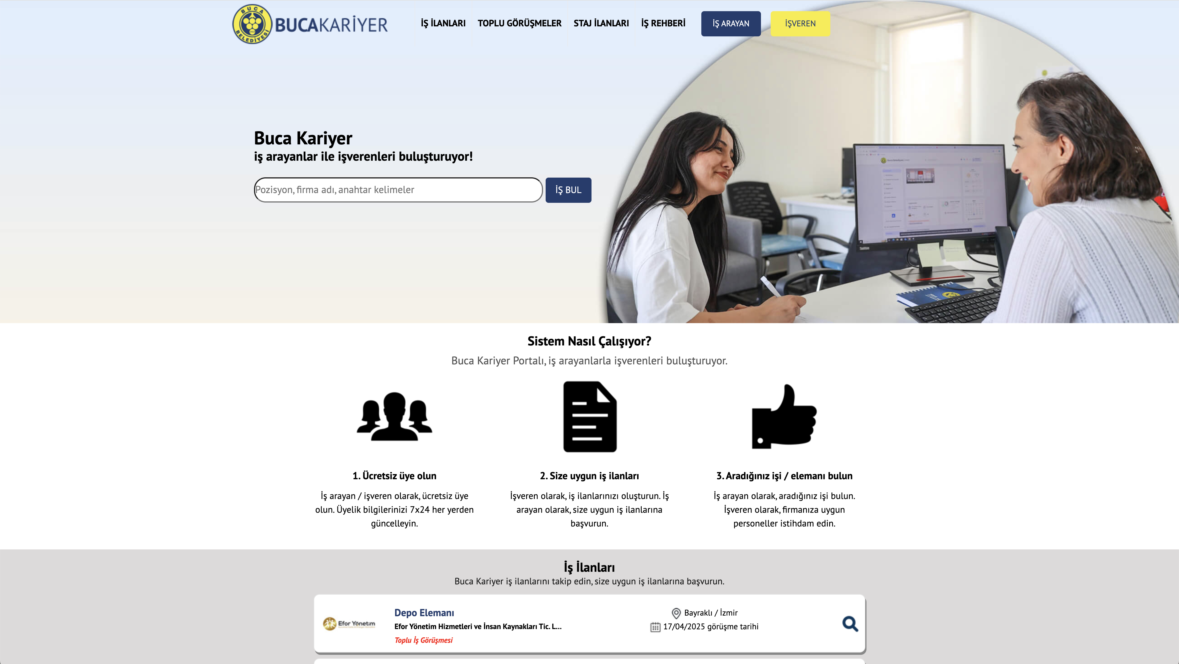 İşsizlikle mücadelede elini taşı altına koyarak iki ayrı Etkin İstihdam Ofisi’ni açan Buca Belediyesi, çalışmalarını www.bucakariyer.com ile güçlendiriyor. İş arayanlar ve işverenlerin ücretsiz olarak üye olabildiği platformda oluşturulan öz geçmiş havuzu sayesinde, şirketler ihtiyaçlarına en uygun adaya kolayca ulaşabiliyor. Platformda yayımlanan iş ilanları sayesinde iş arayanlar, güncel iş ilanlarını takip edebiliyor ve kendilerine uygun pozisyonlara başvurabiliyor.