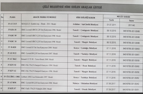 ‘Hibe Edilen Taşıtların Muhasebe Kayıtlarından Düşülmemesi’ bulgusunun altında da, ‘Belediye tarafından hibe edilen taşıtların muhasebe kayıtlarından düşülmediği görülmektedir’ bilgisi verildi. Böylece Çiğli Belediyesi’nin 12 tane ayrı hibe yaptığı görüldü. Buna göre; Ardahan’ın Aşıkşenlik Belediyesi’ne, Tunceli’nin Çemişgezek, Mazgirt, Ovacık, Nazimiye, Hozat belediyelerine, Konya’nın Çatalağzı ve Tuzlukçu belediyeleri ile Malatya’nın Hekimhan Belediyesi’ne araçların hibe edildiği görüldü.