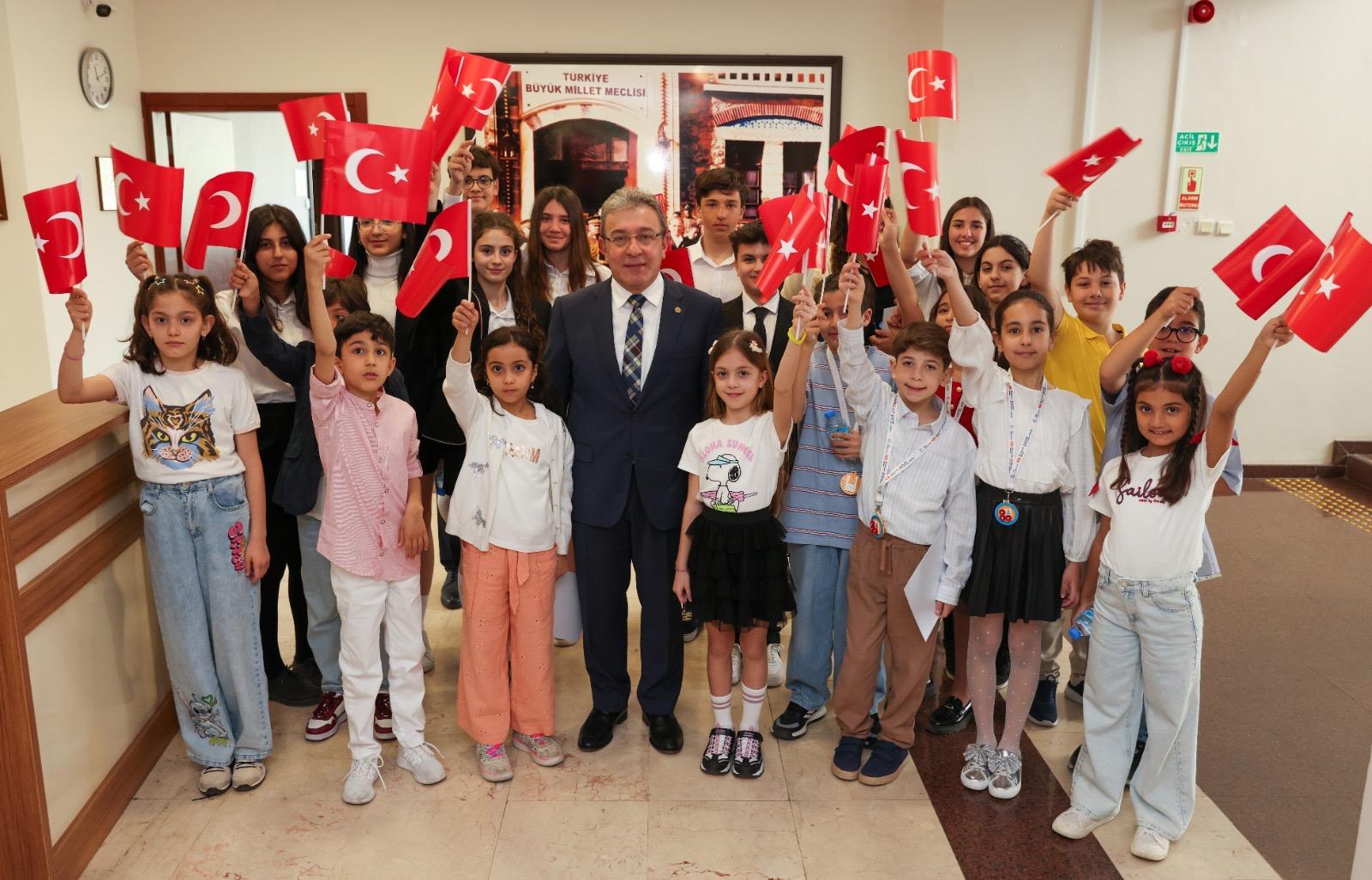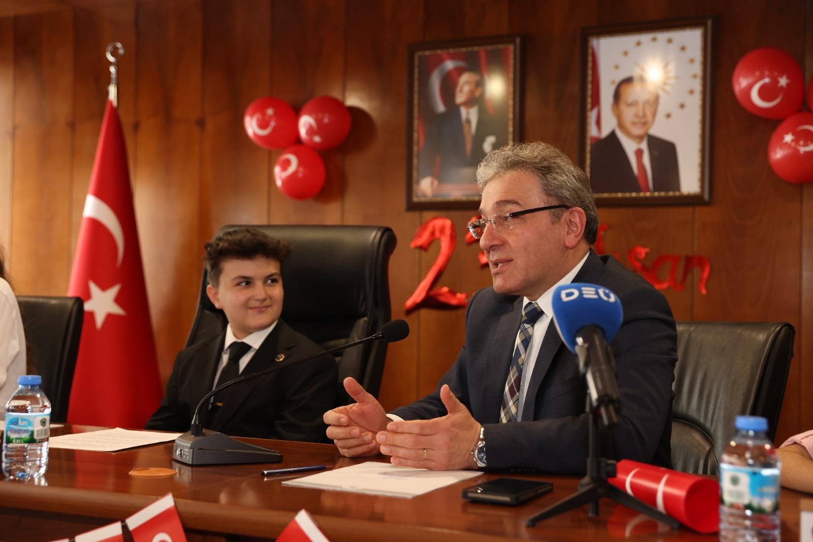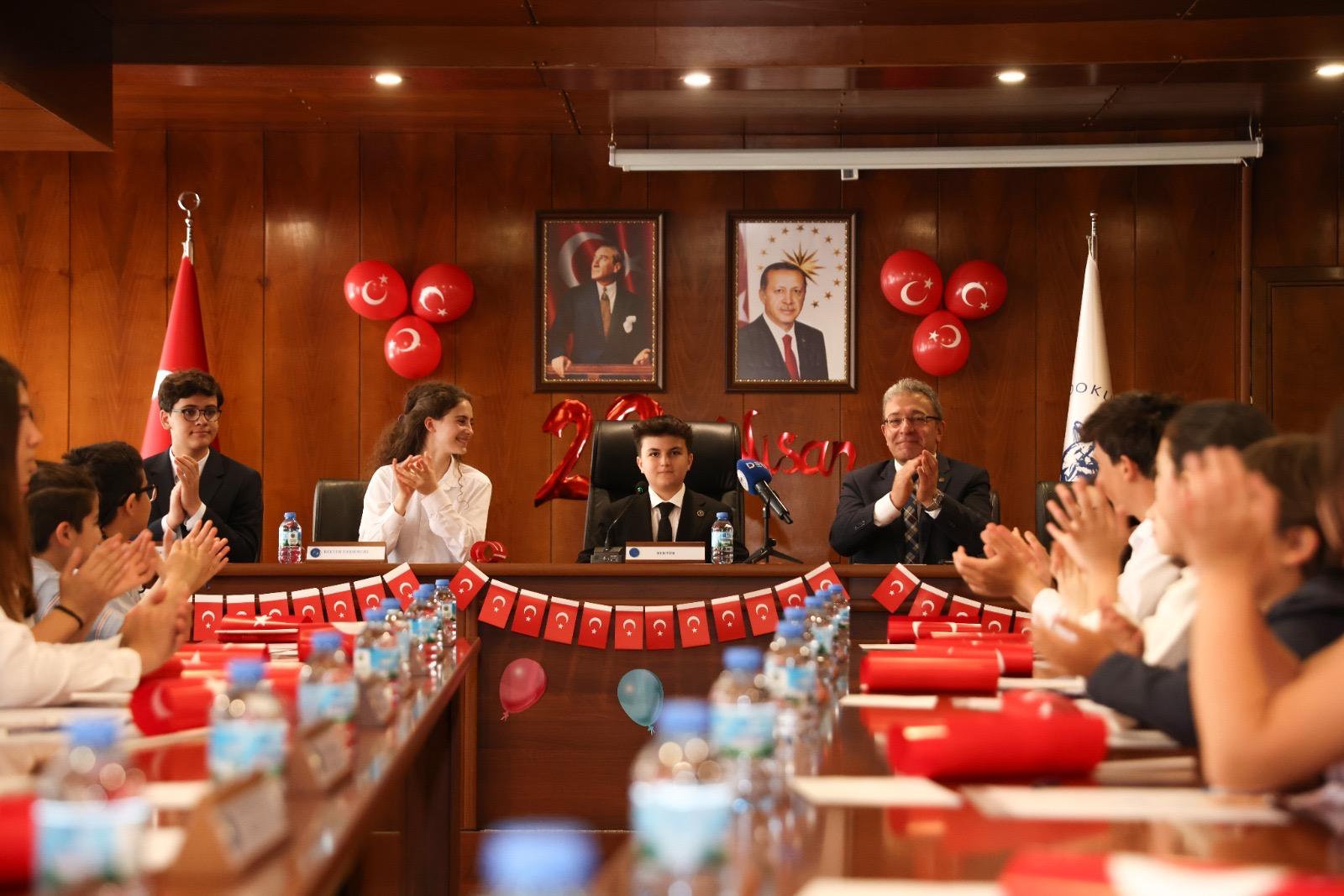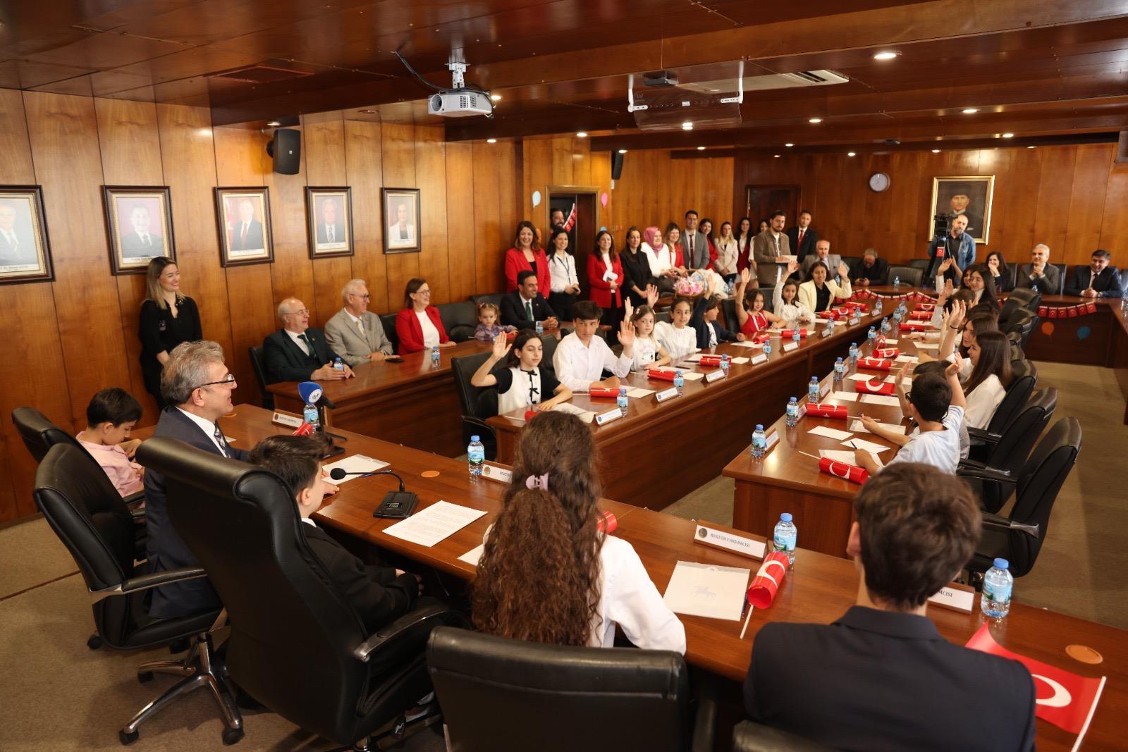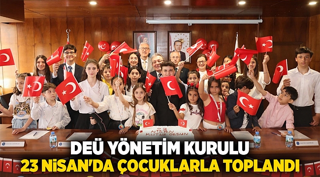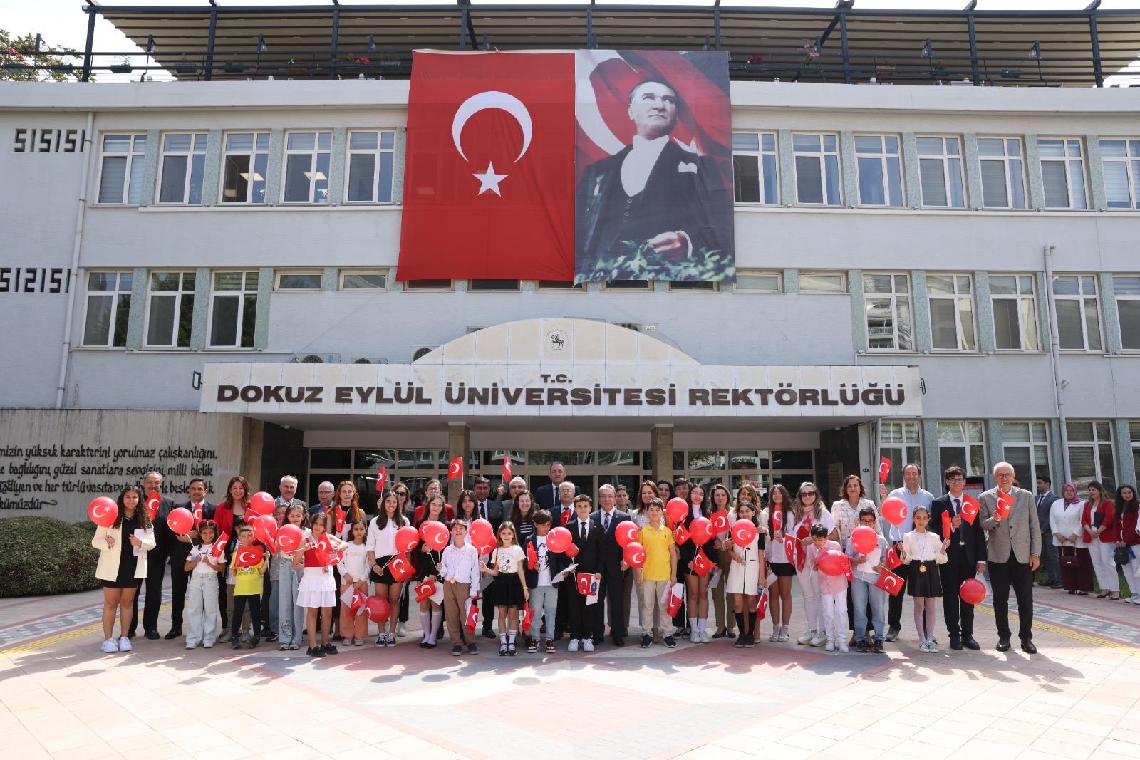 Türkiye Büyük Millet Meclisinin (TBMM) açılışının 105’inci yılı ile 23 Nisan Ulusal Egemenlik ve Çocuk Bayramı dolayısıyla olağanüstü gerçekleştirilen Dokuz Eylül Üniversitesi (DEÜ) Yönetim Kurulu Toplantısı’na, DEÜ’nün Özel 75. Yıl Eğitim Kurumlarında öğrenim gören ana sınıfı, ilkokul ve ortaokul düzeyindeki öğrenciler katıldı. Öğretmenleri ve okul yöneticileriyle birlikte toplantıya katılan 23 öğrenci, DEÜ Rektörlük makamı, rektör yardımcıları ve dekanların yerine geçerek barış dolu, mutlu ve güvenli bir dünya dileklerini yönetim kurulu gündemine sundular. Önerileri oy birliğiyle kabul edilen öğrenciler, 23 Nisan’ı coşku içinde kutladılar.