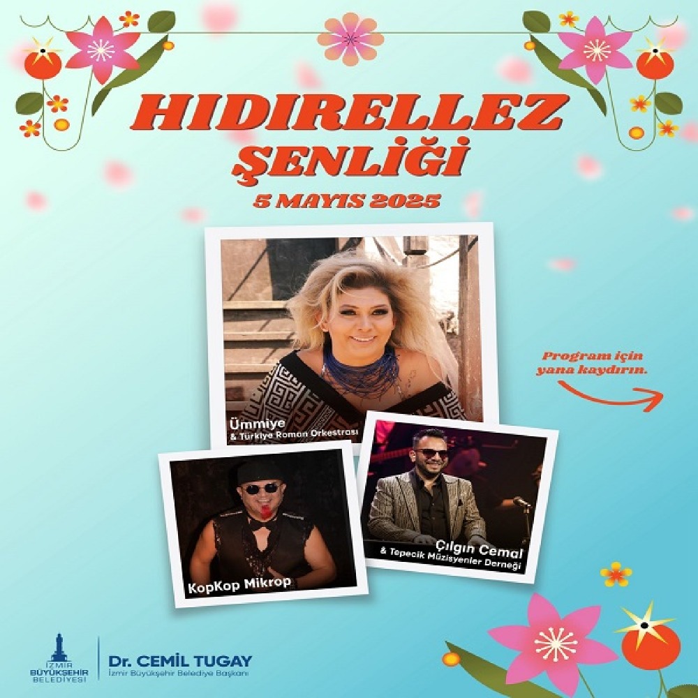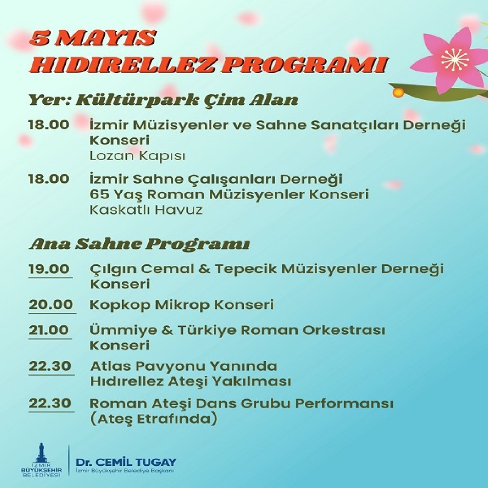 Hıdrellez etkinlikleri, 5 Mayıs’ta Kültürpark çim alanda olacak. Etkinlik kapsamında 18.00’de İzmir Müzisyenler ve Sahne Sanatçıları Derneği, Lozan Kapısı bölümünde konser verecek. Kaskatlı Havuz’da ise İzmir Sahne Çalışanları Derneği 65 Yaş Roman Müzisyenler Konseri yine 18.00’de başlayacak. Ana Sahne’de ise 19.00’da Çılgın Cemal ve Tepecik Müzisyenler Derneği var. Kopkop Mikrop, 20.00’de muhteşem bir performans sergileyecek. Saatler 21.00’i gösterdiğinde Ümmiye ve Türkiye Roman Orkestrası Konseri eğlenceyi doruğa taşıyacak. 22.30’da Atlas Pavyonu’nun yanındaki alanda geleneksel Hıdrellez ateşi yakılacak. Ateş etrafında ise Roman Ateşi Dans Grubu’nun performansı olacak.