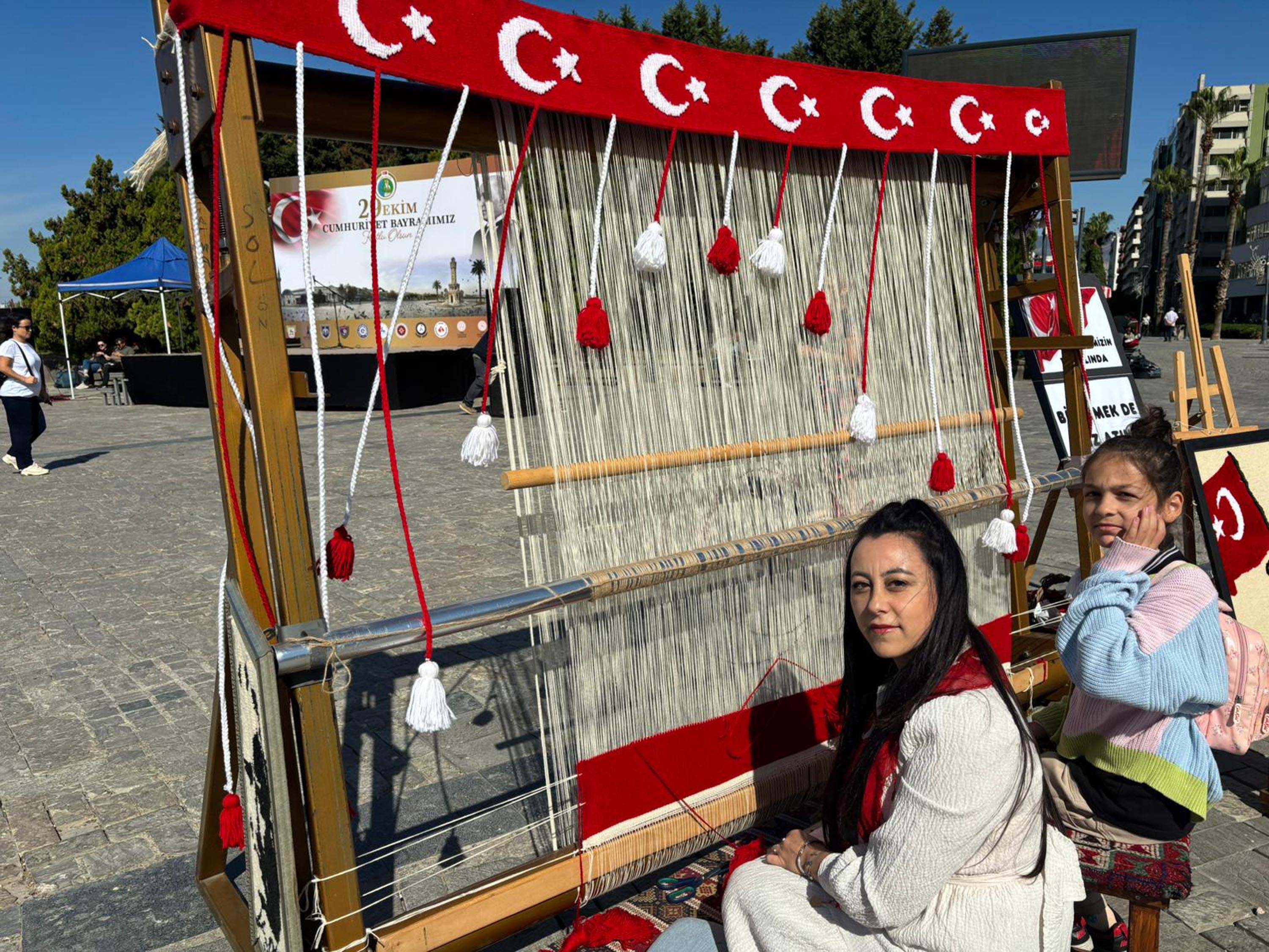 Etkinliğe katılmak isteyen 7'den 70'e İzmirliler, 'Bir ilmek de sen at' sloganıyla Konak Meydanında sırayla dokuma tezgahının başına geçti. İmece usulü el birliği ile Türk bayrağı dokundu.