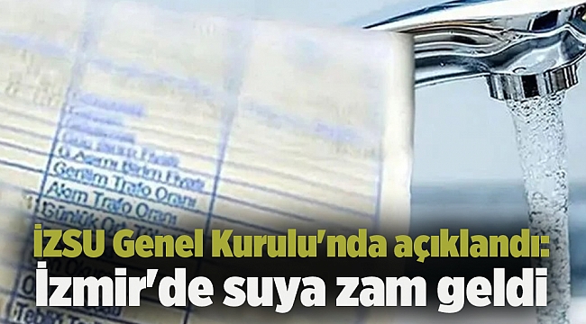 Genel kurul toplantısında ayrıca suya zam yapılma kararı alındı. Meclisten alınan karar sonrası İzmir’de su fiyatlarına yüzde 43,47 zam getirildi. Yeni tarife Ağustos ayı itibari ile faturalara yansıtılacağı belirtildi.