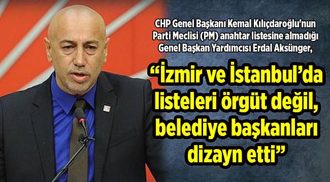 CHP Genel Başkanı Kemal Kılıçdaroğlu'nun Parti Meclisi (PM) anahtar listesine almadığı Genel Başkan Yardımcısı Erdal Aksünger, bu durumu anlamakta güçlük çektiğini belirterek, örgütün listeyi vicdanıyla deldiğini ve PM'ye girdiğini söyledi. Aksünger, özellikle İstanbul ve İzmir sandıklarından çok düşük oy aldığını vurgulayarak, "Buralarda listeleri örgüt değil, belediye başkanları dizayn etti" dedi.