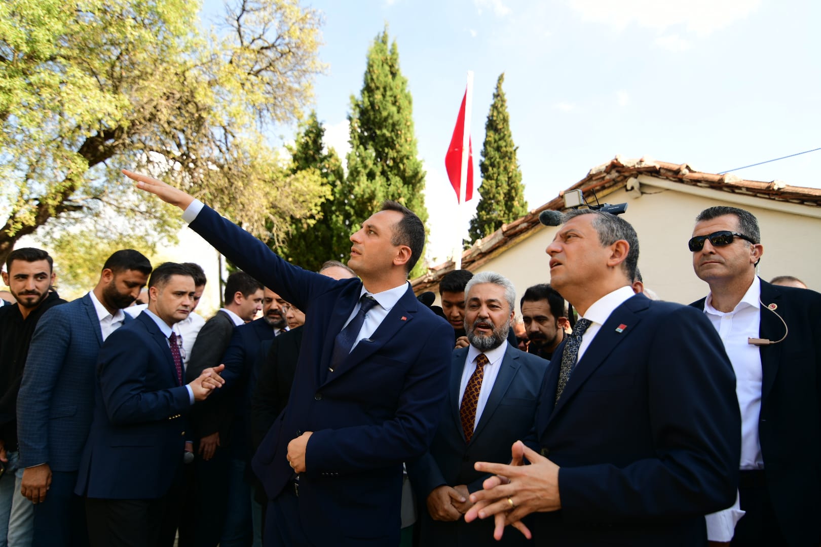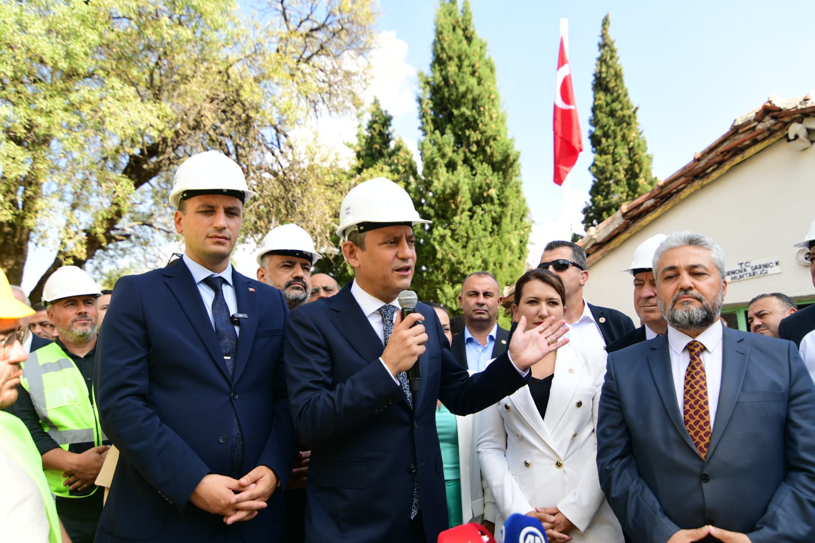 Özgür Özel temel atma töreninin hemen ardından beraberindekilerle birlikte Bornova Belediyesi’nin üretimi gerçekleştirdiği meyve ve zeytin fidanlarını köylüye dağıttı ve ilk fidanların dikimini yaparak can suyu verdi.