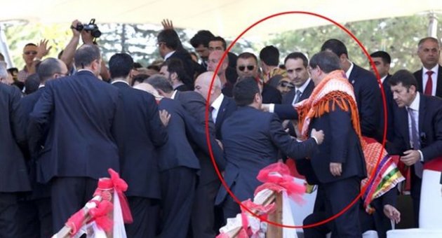 Başbakanlığa ait otobüsle türbenin önüne ulaşan Davutoğlu, Bahçeli'yle tokalaşmak istedi. Bu esnada, Davutoğlu'nun korumalarıyla MHP'liler arasında sözlü ve fiziksel tartışma yaşandı. Davutoğlu, tartışma nedeniyle Bahçeli'yle tokalaşmadan türbeye girdi.