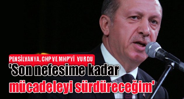 Erdoğan, şöyle konuştu: “Pensilvanya’da inzivaya çekilmene gerek yok. Gel Bursa’ya, gel İstanbul’a, oralarda inzivaya çekil. Niye buralarda durmuyorsun da oralarda duruyorsun. Yoksa oralardan mı medet umuyorsun? 17 Aralık, Türkiye’nin hedeflerine çok büyük saldırıydı. Şahsıma değil, Türk milletine diz çöktürmek hedefteydi. Ülkemize yönelik son saldırı Pensilvanya’nın bürokrasideki eli tarafımıza uzanmak istendi. Milletimizin desteğiyle hamdolsun bertaraf ettik. Türkiye’nin böyle taarruzlara uğramaması için tedbirler aldık. Cumhurbaşkanı seçilirsem yılmayacak bu konuyu da adım adım takip edeceğim. Bu kirli ve hain yapıyla sonuna kadar mücadele edeceğim.”