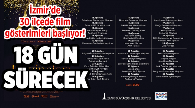 Tüm gösterimler saat 21.00’de eş zamanlı yapılacak. Belgesel 12 Ağustos’ta Seferihisar Cumhuriyet Meydanı’nda ve Ödemiş 125. Yıl Kültürpark’ta, 13 Ağustos’ta Bornova Ayfer Feray Açıkhava Tiyatrosu’nda ve Torbalı Kültür Merkezi’nin bahçesinde, 14 Ağustos’ta Menemen Cumhuriyet Meydanı’ndan, 15 Ağustos’ta Narlıdere Demokrasi Meydanı’nda ve Dikili Nazım Hikmet Parkı’nda, 16 Ağustos’ta Bayındır Kani Bey Parkı ve Gaziemir Sarnıç Cumhuriyet Meydanı’nda, 17 Ağustos’ta Menderes Merkez Amfi Tiyatro’da, 18 Ağustos’ta Kemalpaşa Rekreasyon Alanı’nda, 19 Ağustos’ta Aliağa Demokrasi Meydanı’nda ve Karşıyaka Anıt Demokrasi Meydanı’nda, 20 Ağustos’ta Çiğli Cumhuriyet ve Demokrasi Meydanı Amfi Tiyatro’da ve Urla Meydanı’nda, 22 Ağustos’ta Balçova İnciraltı Adalet Meydanı’nda, 22 Ağustos’ta Konak Vali Kazım Paşa Ortaokulu Bahçesi’nde, 23 Ağustos’ta Kiraz Şehit Birol Uysal Parkı Cumhuriyet Meydanı’nda ve Beydağ 2 Eylül Kurtuluş Parkı’nda, 24 Ağustos’ta Tire Gölet Amfi Tiyatro’da, 25 Ağustos’ta Karaburun Cumhuriyet Meydanı’nda, 26 Ağustos’ta Selçuk İstasyon Meydanı’nda ve Bayraklı Şehit Hakan Ünal Parkı’nda, 27 Ağustos’ta Güzelbahçe Belediyesi Amfi Tiyatro’da ve Karabağlar Uğur Mumcu Parkı Amfi Tiyatro’da, 28 Ağustos’ta Foça İtfaiye Meydanı’nda ve Çeşme Alaçatı Açık Hava Tiyatrosu’nda, 29 Ağustos’ta Kınık Cumhuriyet Meydanı’nda, 30 Ağustos’ta Bergama Cumhuriyet Meydanı’nda ve Buca Hasan Ağa Bahçesi’nde gösterilecek.