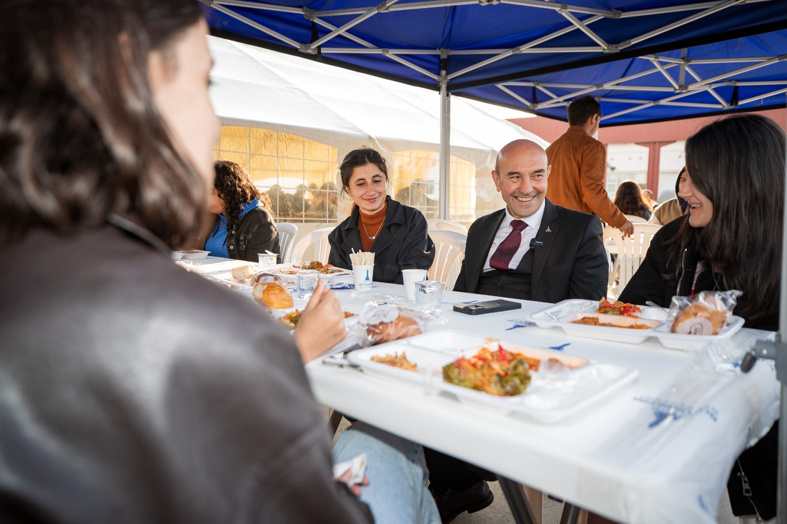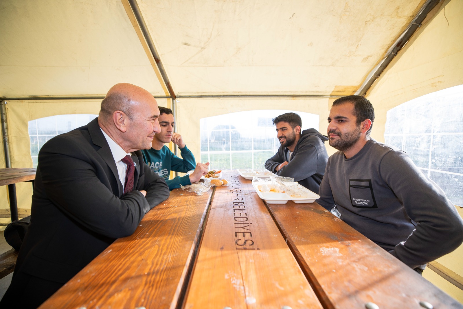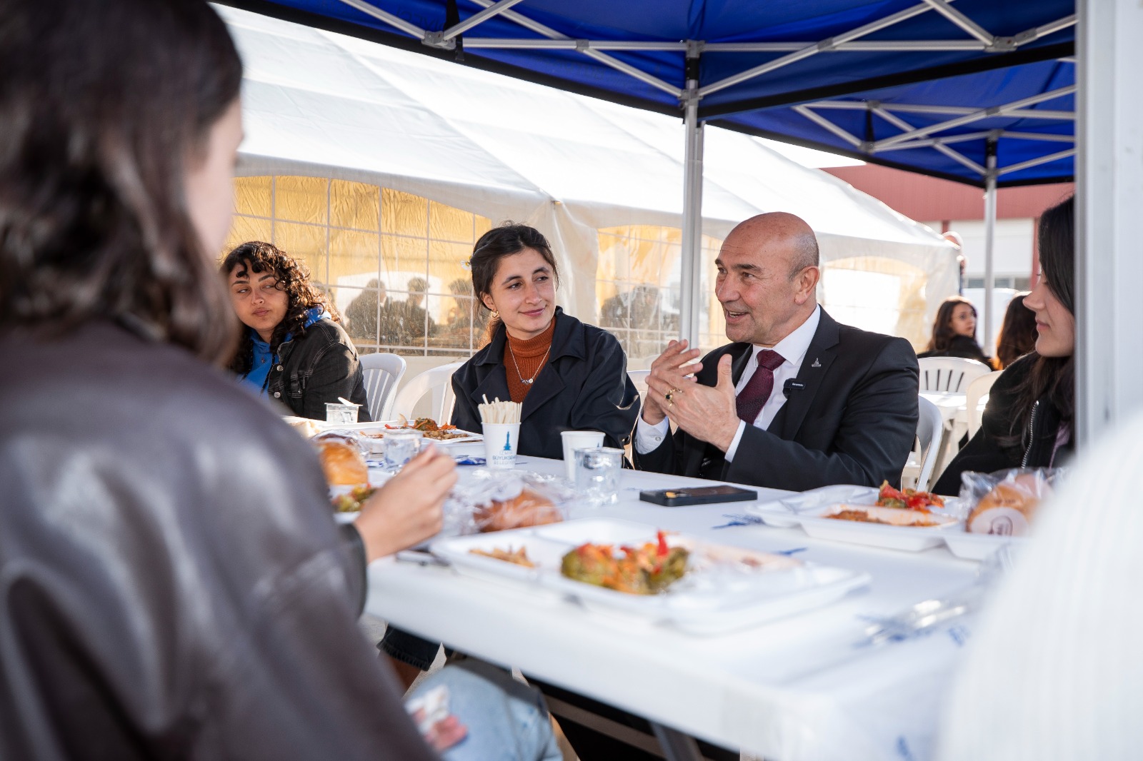 “En çok mutlu olduğum yer onların yanı”Ziyarette konuşan Başkan Soyer, “Bir kere gençlerin içinde nefes alıyorum. En çok mutlu olduğum yer onların yanı. Gerçekten onlarla beraber olmaktan muazzam bir keyif alıyorum. Katip Çelebi Üniversitesi’nin içindeyiz. Burada günde yaklaşık 750 öğrencimize sıcak yemek servisi yapıyoruz. İzmir’in üniversitelerinde bu uygulamayı başlatmıştık. Katip Çelebi’de de bu işi sürdürüyoruz. Geçen sene kapının dışında yemek veriliyordu. Bu sene rektörlük izin verdi ve içeride hizmet veriyoruz. Çok iyi oldu. Çadırlarla çocukları biraz daha soğuktan koruyan bir şekilde hizmet veriyoruz. Sordum, soruşturdum, çok memnunlar” diye konuştu.,