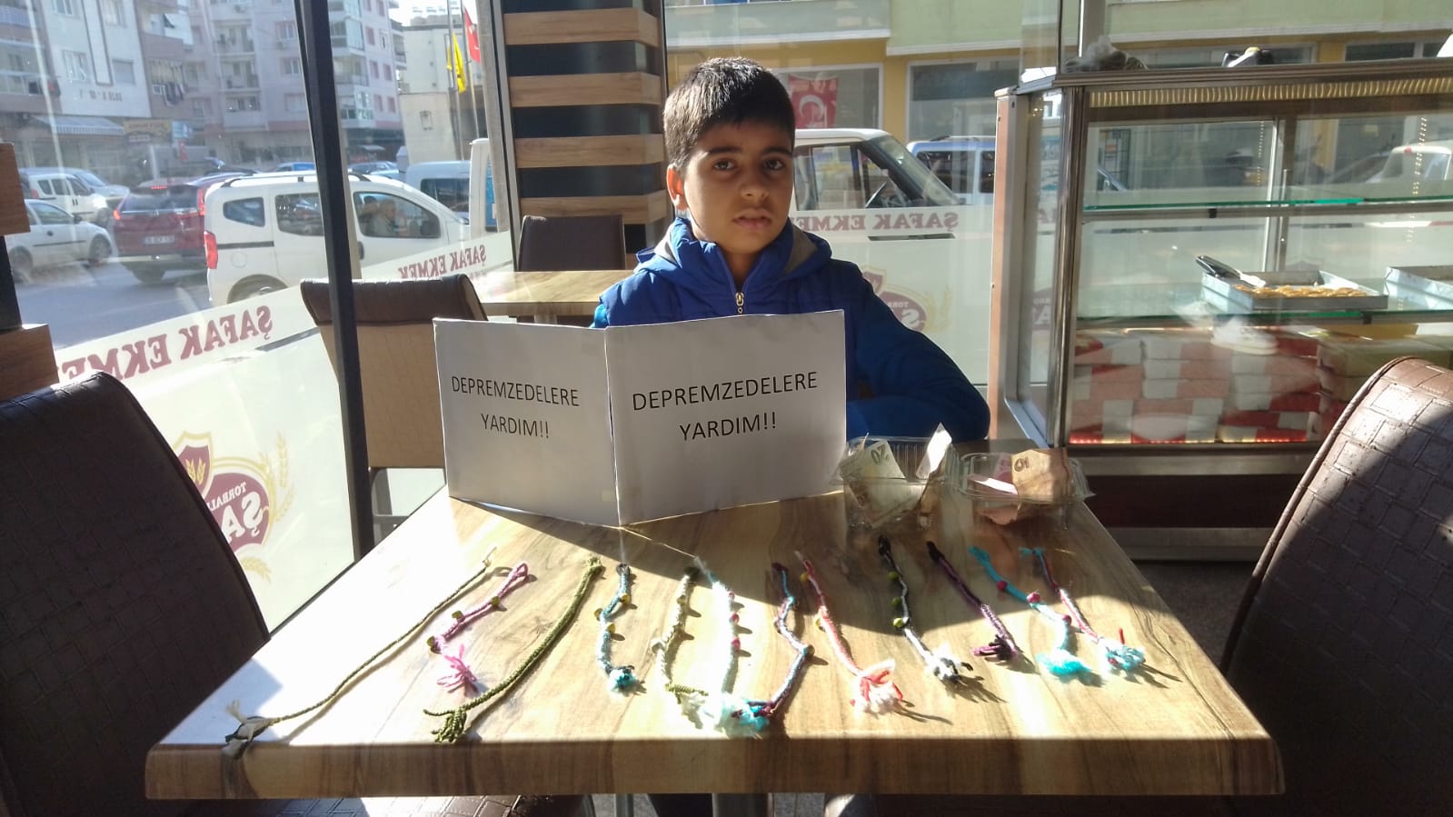 10 yaşındaki ilkokul 5. sınıf öğrencisi Burak Turan el işi boncuklarını satarak depremzedelere yardımcı olmak için para topluyor