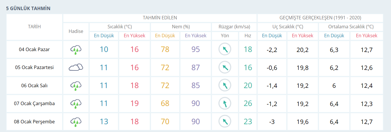 Meteoroloji tahminlerine göre İzmir yeni haftaya da yağışlı hava ile başlayacak. 5 Ocak Pazartesi günü sağanak yağış beklenirken hava sıcaklığının 16 derece olacağı tahmin ediliyor. 6 Ocak Salı günü sıcaklığın 18 dereceye, 7 Ocak Çarşamba günü ise 19 dereceye çıkması öngörülüyor. 8 Ocak Perşembe günü hava sıcaklığının 18 derece olacağı ve yağışlı havanın hafta boyunca etkisini sürdüreceği belirtiliyor.