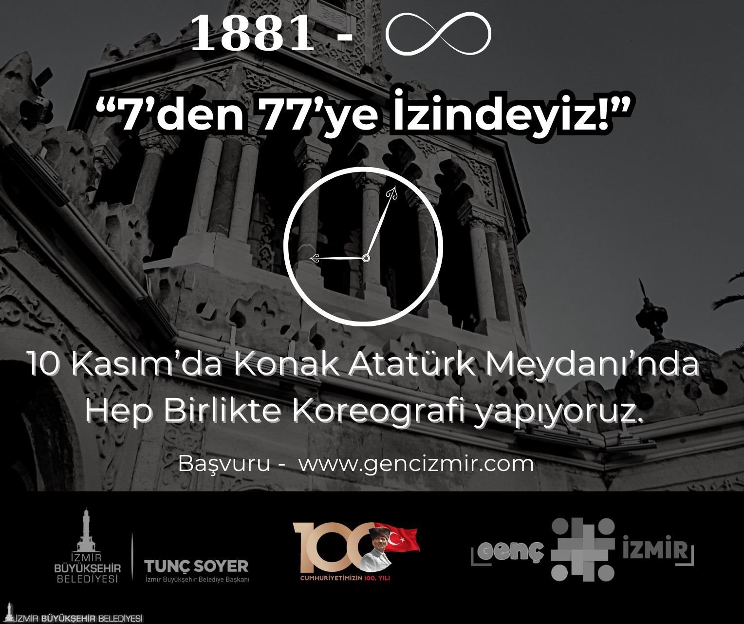 İzmir Büyükşehir Belediyesi, ulu önder Mustafa Kemal Atatürk’ün ölümünün 85. yıldönümünde Konak Atatürk Meydanı’nda 10 Kasım saat 09.05’te “7’den 77’ye İzindeyiz!” yazıyor. Saat Kulesi etrafına ise ''09:05'' saat görseli koreografisi yapılacak. Herhangi bir yaş sınırının olmadığı etkinliğe katılmak isteyen İzmirliler gencizmir.com adresinden başvurabilir.