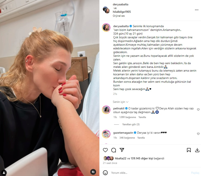 Instagram hesabından sık sık Hilal'in tedavi sürecini paylaşan Balta, bir kolunu kaybeden ve bacaklarında ciddi hasar oluşan küçük kızın yürümeye başladığını ilan etti. Hilal ile 10 aydır verdikleri mücadeleyi gösterdiği bir video yayınlayan Balta, şu ifadeleri kullandı: "Seninle ilk konuşmamda sen bizim kahramanımızsın demiştim. Anlamamıştın... 324 gün.(10 ay 21 gün) Çok büyük savaşlar verdin. Gerçek bir kahraman gibi başını öne hiç düşürmedin. Ağladın ama hep dik durdun. Şimdi ayaktasın. Kimseye muhtaç kalmadan yürümeye devam edebileceksin inşallah. Ailen için verdiğin sözlerin arkasına koşarak gideceksin. Senin için ne yazsam az. Bunu toparlayacak afili sözlerim de yok zaten. Sen geldin işte... Ansızın... Belki de ben hep seni bekledim Ya da melek ailen gönderdi seni bana kim bilir. Melek ailenin yerini tutamayız bunu da istemeyiz zaten ama senin kocaman bir ailen daha var. Sen yürü ben hep arkandayım, düşersen kaldırır yine sıvazlarım sırtını. Bundan sonra atacağın her adım seni mutluluğa götürsün bal kızım. Seni hep çok seveceğim."