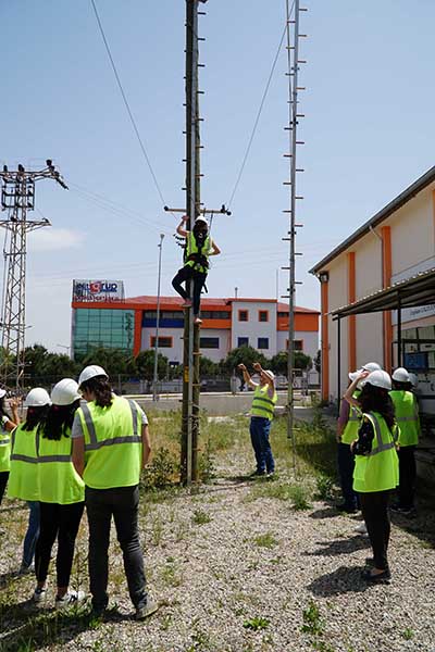 Uzman kadronun eşlik ettiği gezide öğrenciler elektrik dağıtım sistemleri hakkında bilgilendirilirken, eğitim sahasında yüksekte çalışma deneyimini de yaşadılar.