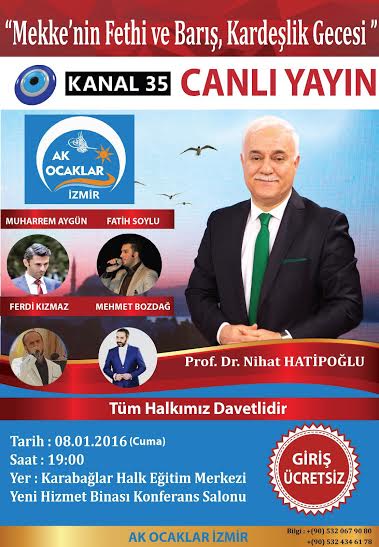 Gazetem İzmir - Ak Ocaklar İzmir İl Başkanlığı 08.01.2016 Cuma günü (bugün) saat 19.00’da Mekke’nin Fethi ve Barış, Kardeşlik Gecesi adında etkinlik düzenliyor. Karabağlar Halk Eğitim Merkezi Yeni Hizmet Binası Konferans Salonu’nda gerçekleşecek etkinliğe Prof. Dr. Nihat Hatipoğlu’da konuşmacı olarak katılacak. Tüm İzmirlilerin davetli olduğu etkinliğe giriş ücretsiz olacak…