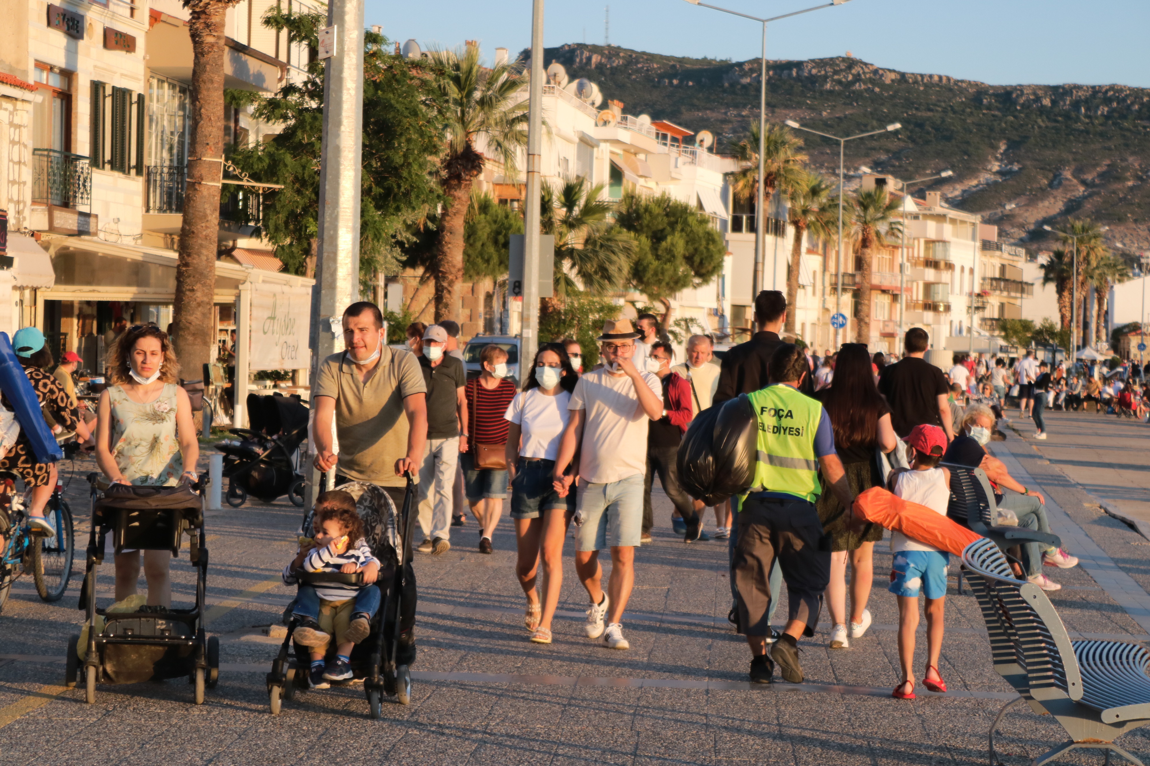 Foça pandemi sürecindeki en yoğun günlerinden birini (5 Haziran 2021 Cumartesi günü) yaşadı. İzmir, Manisa ve çevre yerleşim yerlerinden ilçeye gelen binlerce vatandaş pandemi öncesi yaz günlerini hatırlatan görüntüler oluşturdu. Meydan, cadde ve sokaklarda kalabalıklar, sahilde oturanlar, denizde yüzenler, oltalarını rastgele diyerek mavi sulara atanlar, bisikletlerine binen, koşan oynayan çocuklar keyfilerince bir gün geçirdiler. İlçenin ünlü dondurmacıları, kafe ve restoranları, hatta seyyar satıcılar önünde kuyruklar oluştu. Araç yoğunluğu ana arterlerde trafiğin sıkışmasına ve ilçede otopark sıkıntısı yaşanmasına neden oldu. İZBAN tren aktarmalı belediye (ESHOT) otobüsleri de gün boyu ilçeye yolcu taşırken otobüs duraklarında bekleyenler yoğun kuyruklar oluşturdular.