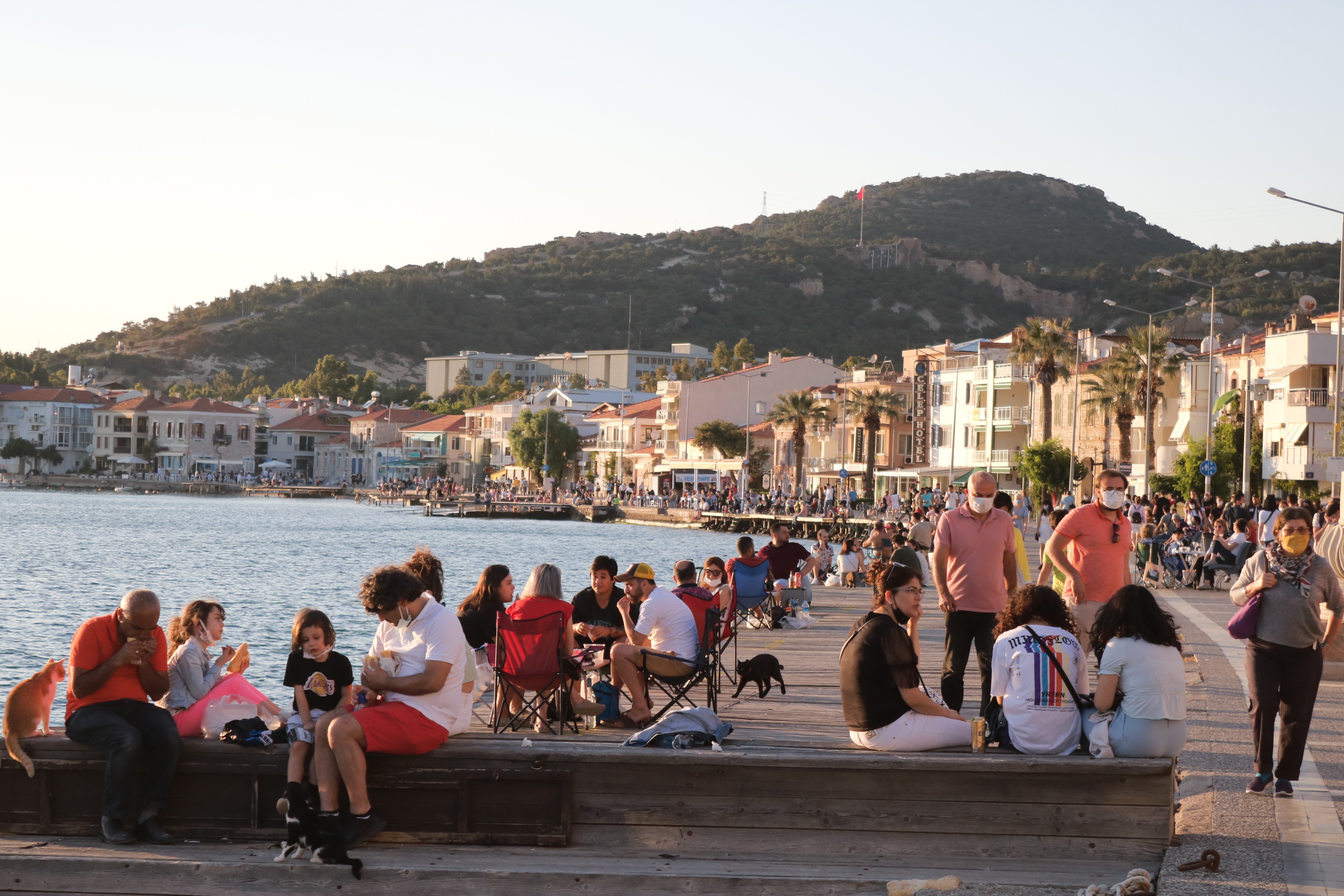 İzmir’in turistik İlçesi Foça tam kapanma günlerinin sonrası kısıtlamanın olmadığı ilk Cumartesi günü İzmir ve çevre yerleşim yerlerinden gelenlerin akınına uğradı. Gün boyu sahillerde gezen, denize giren, açık olan restoran ve kafelerde oturarak keyif yapan vatandaşlar akşam saatlerinde de muhteşem gün batımı manzarasını seyrettiler. Serbestçe gezdikleri günleri özlediklerini (ve Pazar günü tekrar sokağa kısıtlaması olduğunu) belirten vatandaşlar ilçeden ayrılmak istemediler.