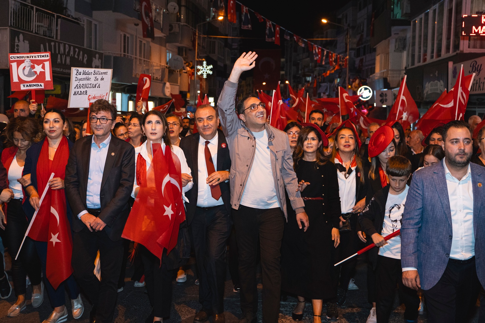 Cumhuriyet coşkusu, akşam saatlerinde Ata Caddesi üzerindeki Duru Park önünden başlayan Büyük Cumhuriyet Yürüyüşü ile doruğa ulaştı. Ellerinde Türk bayraklarıyla marşlar söyleyerek yürüyen Balçovalılar, sık sık “Mustafa Kemal’in Askerleriyiz” ve “Yaşasın Cumhuriyet” sloganları attı. Ata Caddesi’ni takip eden Sakarya Caddesi’ni de geçen Balçovalılar, yürüyüşün son noktası olan ve Bulutsuzluk Özlemi Grubu’nun konserinin de gerçekleşeceği Ekonomi Üniversitesi Açık Hava Tiyatrosu’na ulaştı. Konser öncesi konuşan Balçova Belediye Başkanı Onur Yiğit, şunları söyledi: “Bugün çok güzelsin Balçova, Halkçı, halktan yana Balçova, Devletini, milletini koruyan Balçova, 81 ildeki vatandaşlarını seven milliyetçi Balçova, ilerici, yenilikçi, değişimci devrimci Balçova ve bu değerlere sahip Cumhuriyetçi Balçova. Cumhuriyetimizin 101. Yılı kutu olsun. Bugün çok büyük bir coşkuyla buraya geldik. Alanlara, yollara sığmadık. Bugün gurur dolu bir gün. Eğlenmek de hakkımız. Fakat geçen hafta yaşanan terör saldırısı hepimizi çok üzdü. 5 vatandaşımızı kaybettik. İçimiz yanıyor. Çok üzülüyoruz. Umarız bir daha böyle bir şey yaşamayız. Bu olay üzerine bize ‘konserleri, fener alaylarınızı iptal edebilirsiniz’ dediler. Terör korkudan beslenir. Biz onlardan korkarsak amaçlarına ulaşırlar. Biz onlardan korkmuyoruz. Siz de korkmuyorsunuz. Neden korkmuyorsunuz biliyor musunuz? Çünkü sizlerin genetiğinde var. Çünkü 101 yıl önce korkmayanlar, savaş meydanlarında canları pahasına bu ülkeyi kurdular. Sizler onların evlatlarısınız. Korkmuyoruz. Yaşasın Cumhuriyet! Yaşasın Balçova! Yaşasın Türkiye!”