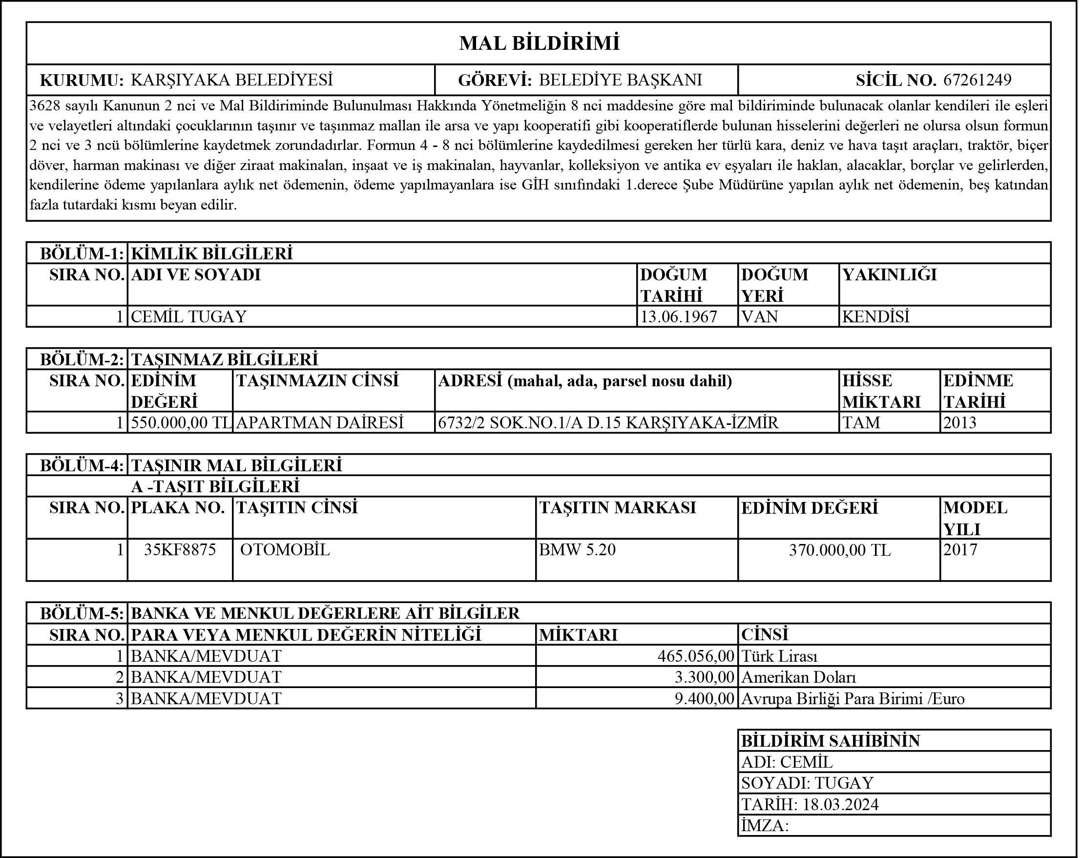 CHP İzmir Büyükşehir Belediye Başkan Adayı Dr. Cemil Tugay’ın seçim ofisinden yapılan açıklamaya göre; Cemil Tugay, 2024 rayicine göre 15 milyon TL değerinde hâlihazırda oturduğu apartman dairesinin ve 2 milyon 200 bin TL değerinde 2017 model BMW 5.20 marka otomobilin sahibi. Cemil Tugay’ın banka hesaplarında 465 bin 56 Türk Lirası, 3 bin 300 Amerikan Doları, 9 bin 400 Euro nakit parası bulunuyor. Eşi adına kayıtlı menkul veya gayrimenkul mal varlığı bulunmuyor.