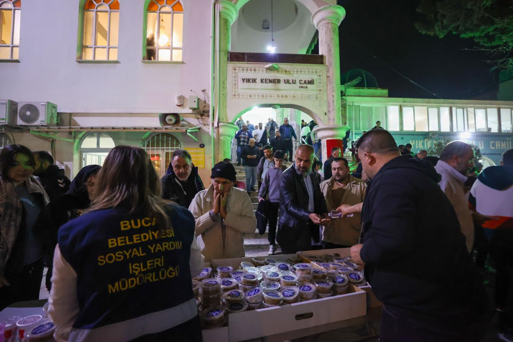 Buca'daki çeşitli camilerde ise teravih namazı sonrası vatandaşlara helva ve gül suyu dağıtıldı.