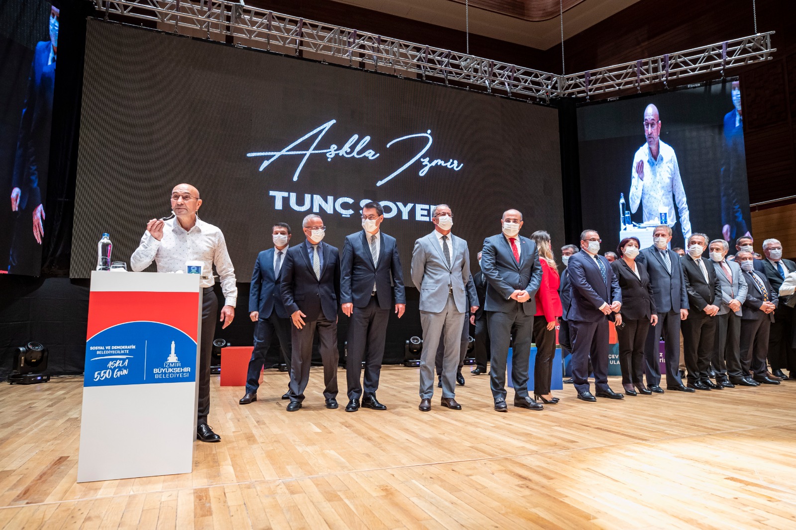 İzmir Büyükşehir Belediye Başkanı Tunç Soyer konuşmasının son bölümünde ise dünyada hüküm süren adaletsizlik ve emek sömürüsüne dikkat çekti. İnsanlığın bu iki gerçekle birden yüzleşmek zorunda olduğunu belirten Soyer, konuşmasını şu sözlerle noktaladı: “İzmir’de bir yandan limanla, teknolojiyle, demokrasiyle, tarımla, turizmle refahı büyüteceğiz... Bir yandan da bu adaletsizlikle, haksızlık, hukuksuzlukla, yoksullukla, bölünmüşlükle mücadeleye devam edeceğiz. Emin olun kazanacağız. Bunu hep birlikte başaracağız. Çünkü biz hepimiz birlikte varız ve birbirimize muhtacız. Biz aslında birlikte İzmir’iz. Barış içinde, aşkla bir arada yaşamanın yollarını hep birlikte bulacağız, ya bir yol bulacağız ya da bir yol yapacağız. Göreceksiniz yapacağız, çünkü bu bizim ortak kaderimiz. Biz buna mukt ediriz. Diyorum ya, Biz İzmiriz.”