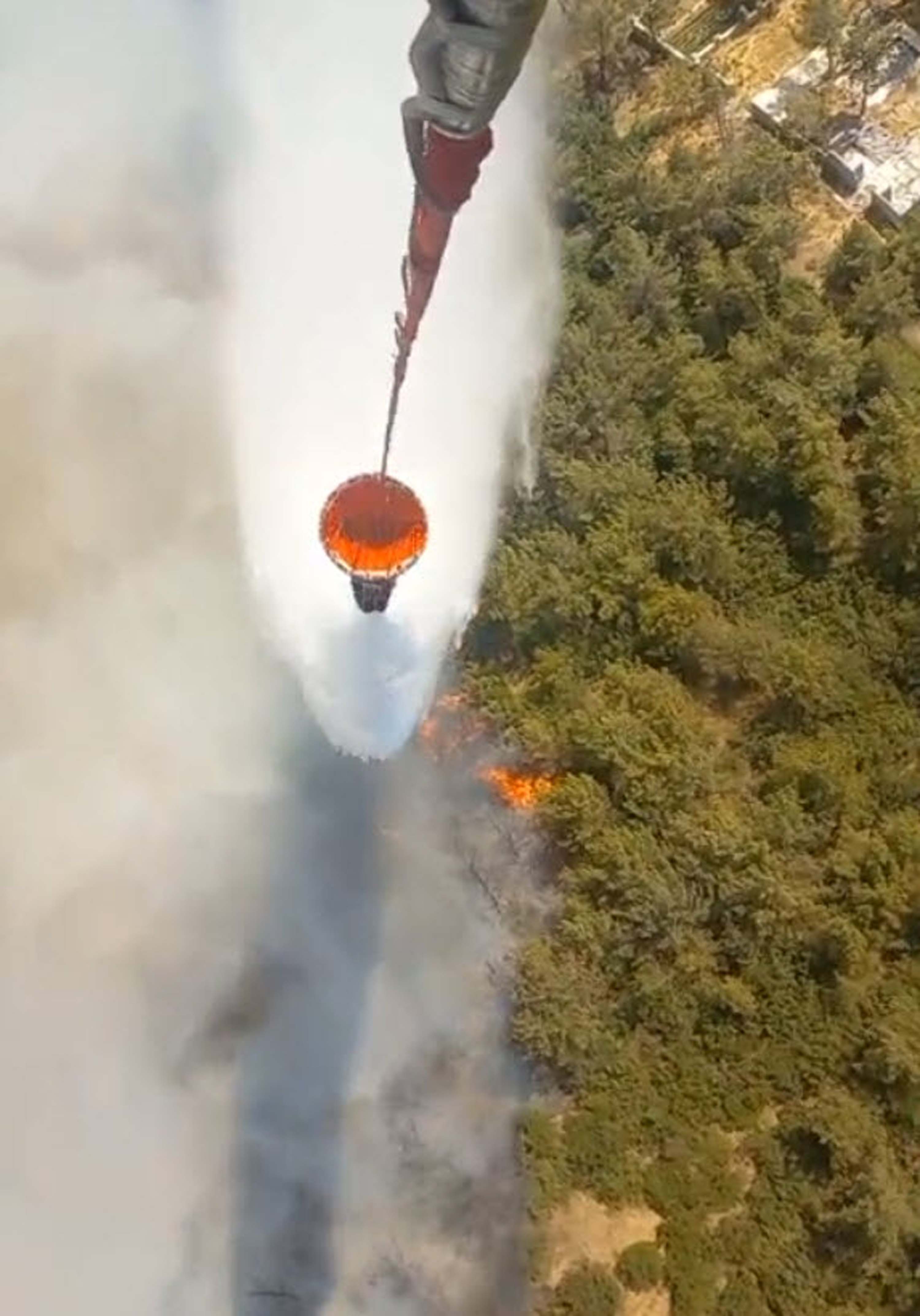 Çevredekiler ihbarı üzerine bölgeye İzmir Orman Bölge Müdürlüğü'ne ait 2 uçak, 9 helikopter, 17 arazöz, 5 su ikmal, 3 dozer sevk edildi. Ekipler alevlere havadan ve karadan müdahale ediyor. (DHA)