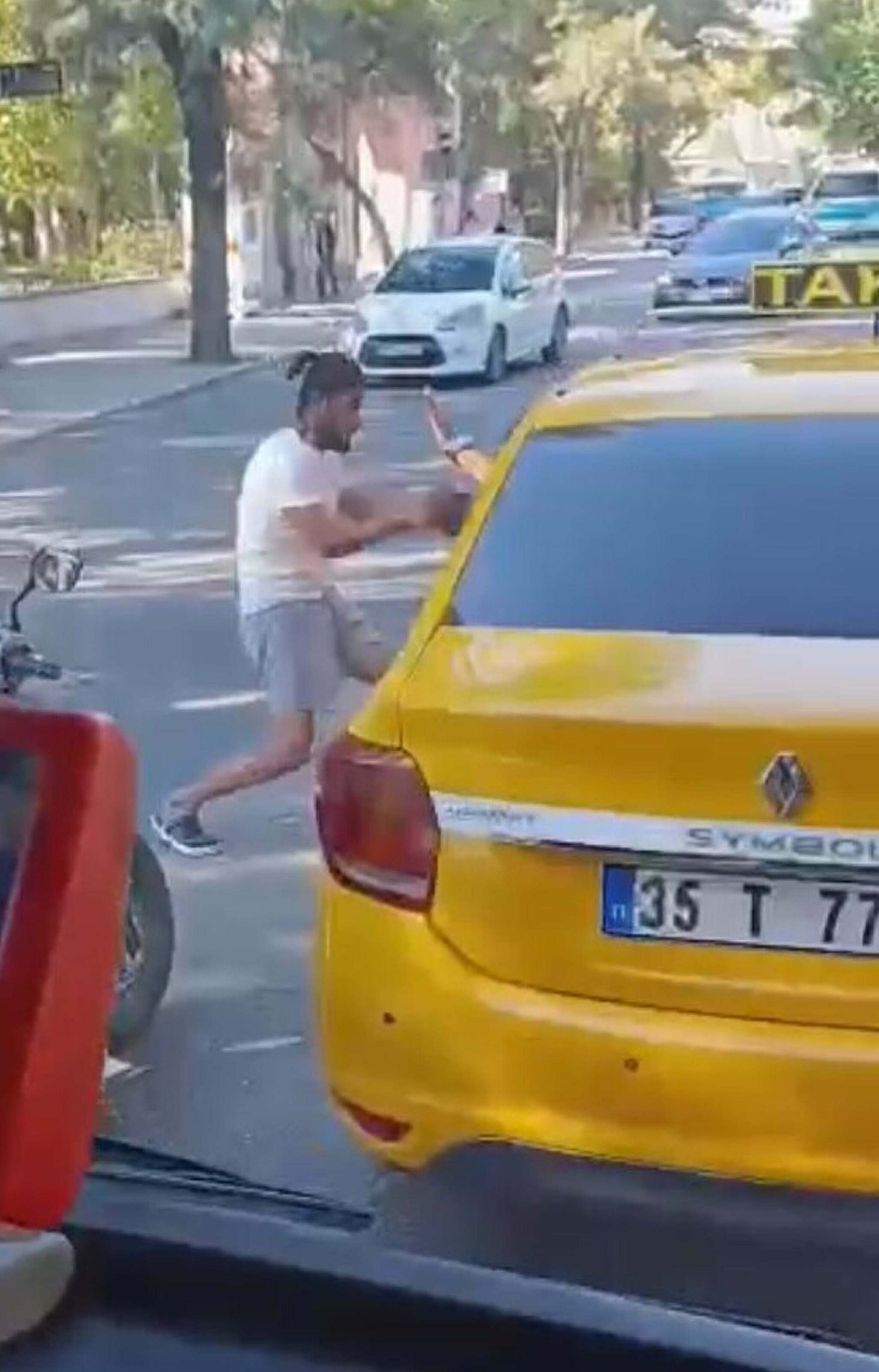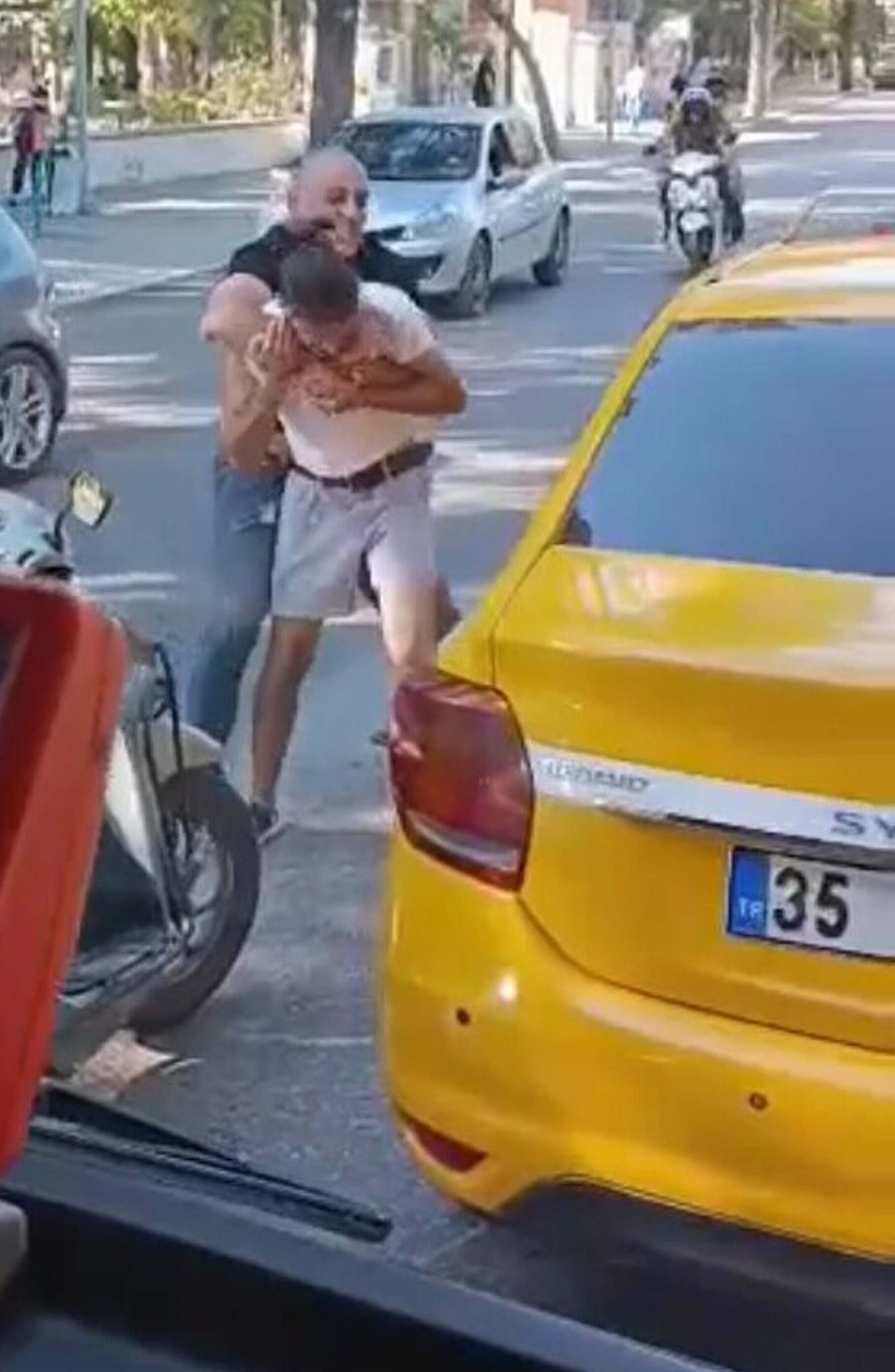 Taksiden inen şoför ile kurye arasında tekmeli ve yumruklu kavga çıktı. Çevredekiler, tarafları ayırıp kavgayı sonlandırdı. Tarafların birbirinden şikayetçi olmadığı öğrenildi. Kavga anı, çevredekilerden biri tarafından cep telefonuyla kaydedildi.