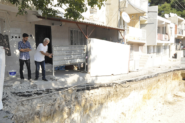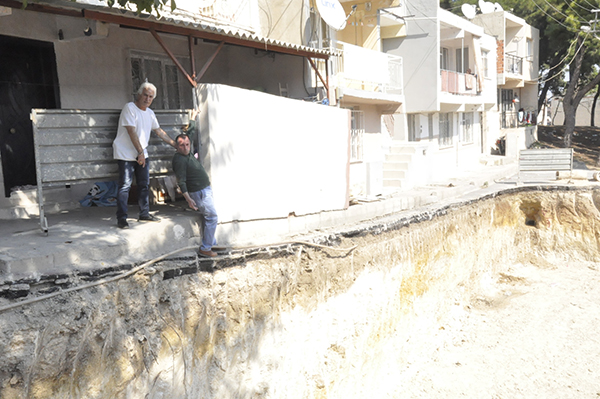 İnşaat arazinin hemen yanında bulunan binada ikamet eden Seyithan Aykal, kızının konuyla ilgili olarak Karabağlar Belediyesi’nin yanı sıra İzmir Büyükşehir Belediyesi ve Karabağlar Kaymakamlığı’na başvurduğunu fakat sonuç alamadıklarını söyleyerek, “Biz yıllardan beri burada oturuyoruz. Karşımızda bulunan 3 tane ev ve araziyi müteahhitin aldığını duyduk. Müteahhit iş makinelerini getirerek burada kazı çalışmalarına başladı. Sonrasında bir baktık ki bizim binamızın dibine kadar girdi. Bu sırada asfalt olan yolu bile inşaatına dahil etti. Bizim binalarımız çatladı. Kanalizasyon borularımız hep patladı. Şuan evin içi bile sinek kaynıyor. Konuyu Karabağlar Belediyesi’ne gittim şikayet ettim ama CİMER’e şikayet açmamı, kendilerinin yapacak bir şeylerinin bulunmadığını söylediler. İzmir Büyükşehir Belediyesi’ne gittim beni Karabağlar Kaymakamlığı’na gönderdiler, Kaymakamlık da aynı şekilde beni CİMER’e yönlendirdi. Müteahhitle görüştük madem böyle yaptın gel bizim evleri de yık inşaatına dahil et dedik ona da yok diyor. Zararımızı da karşılamıyor. Ne yapacağımızı bilemiyoruz. Yetkililerden biran önce bizim sorunumuzu çözmelerini istiyoruz” ifadelerine yer verdi.