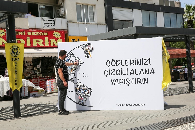 İzmir’in en kalabalık ilçesi Buca’da, giderek artan çevre kirliliğiyle ilgili ilginç bir farkındalık çalışması yapıldı. En fazla yoğunluğun yaşandığı Forbes Caddesi girişine ikiye bölünmüş dünya görseli yerleştiren Buca Belediyesi, vatandaşlardan çöplerini bu panoya yapıştırmasını istedi.