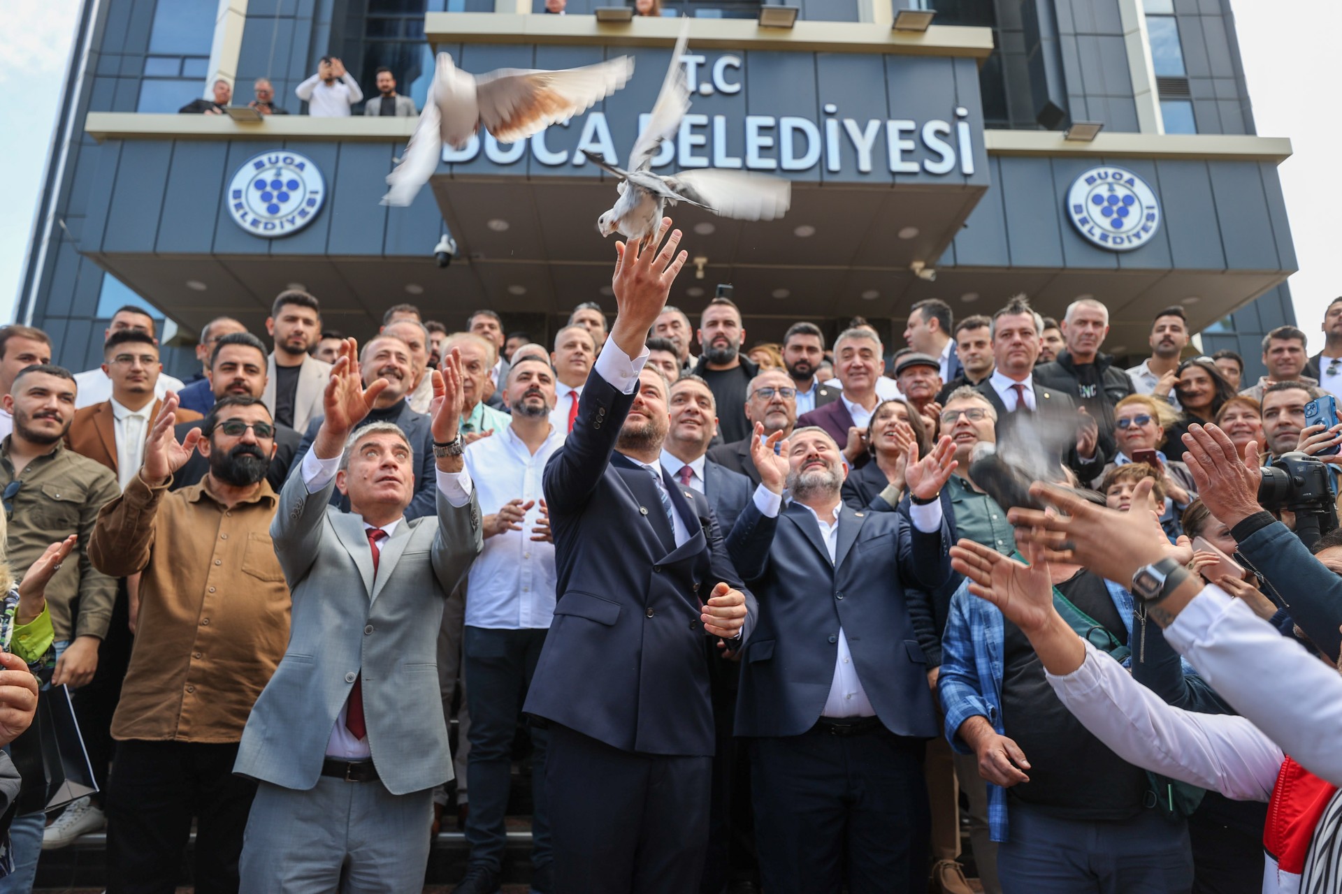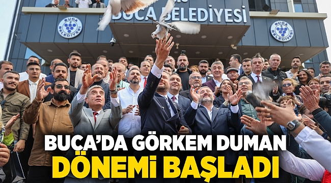 31 Mart Yerel Seçimleri’nden zaferle çıkan Buca Belediye Başkanı Görkem Duman, bugün görevine başladı. Eski Başkan Erhan Kılıç’tan görevi devralan Görkem Duman, belediye binası önüne çıkarak Bucalılara seslendi. Kendisine oy versin ya da vermesin bütün Bucalılara hizmet için çalışacağına söz veren Duman, konuşmasının ardından barış güvercinleri uçurdu.