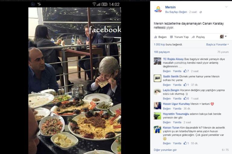 Mersin Büyükşehir Belediyesi tarafından düzenlenen ‘Yaşam Boyu Sağlıklı ve Dengeli Beslenme Semineri’ kapsamında şehre giden Prof. Dr. Canan Karatay'ın ekmek yerken görüntüleri sosyal paylaşım sitesi Facebook'ta "Mersin" sayfasında yayınlandı. Kullanıcıların fotoğrafa esprili yorumları dikkat çekti. Hürriyet'in haberine göre; Canan Karatay'ın editörü ise ekmek değil lahmacun yediğini belirtti. Sayfanın birkaç saat önce paylaştığı fotoğraf kısa sürede onlarca yorum yapıldı. Okuyucuların fotoğrafa, "Canan hoca Mersin lezzetlerine dayanamadı" gibi yorumlar yaptığı görüldü.