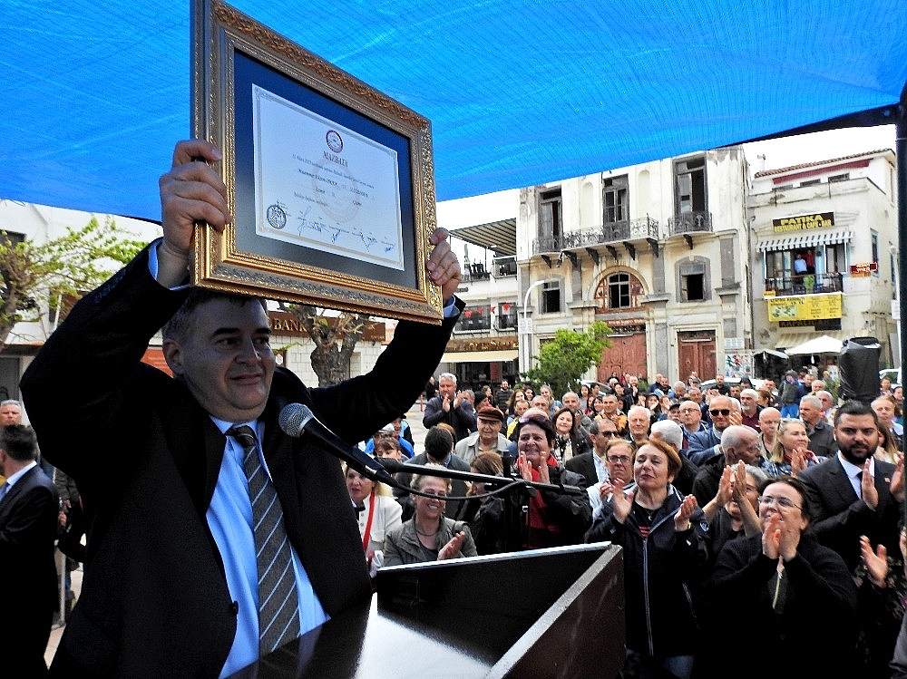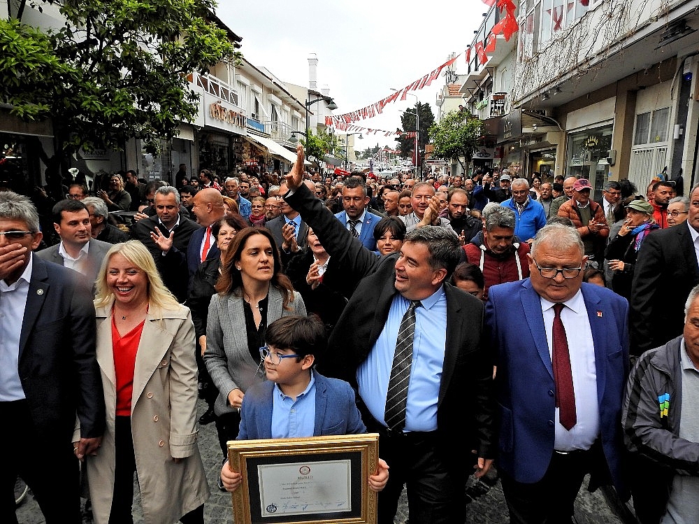 Belediye Başkanı Oran ve belediye meclis üyeleri, mazbatalarını almalarının ardından yüzlerce vatandaş ile birlikte bando eşliğinde Çeşme çarşısında yürüdü.