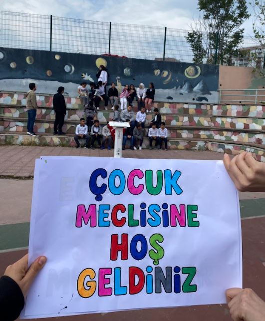 Ardından okul bahçesi, çocukların emeğiyle sembolik bir meclis alanına dönüştürüldü. Duvarlar bayraklarla, afişlerle, çocukların boyadığı resimlerle donatıldı. Sınıfın en büyük öğrencisinin meclis başkanı seçilmesiyle simülasyon başladı. Çocuklar gruplara ayrıldı ve her grup Atatürk’ün bir ilkesini temsil etti. Ardından kendi fikirleriyle, okul yaşamına dair önergeler hazırlayıp kürsüde sundular. Gerçek bir oylama süreciyle öneriler değerlendirildi ve kabul edildi.