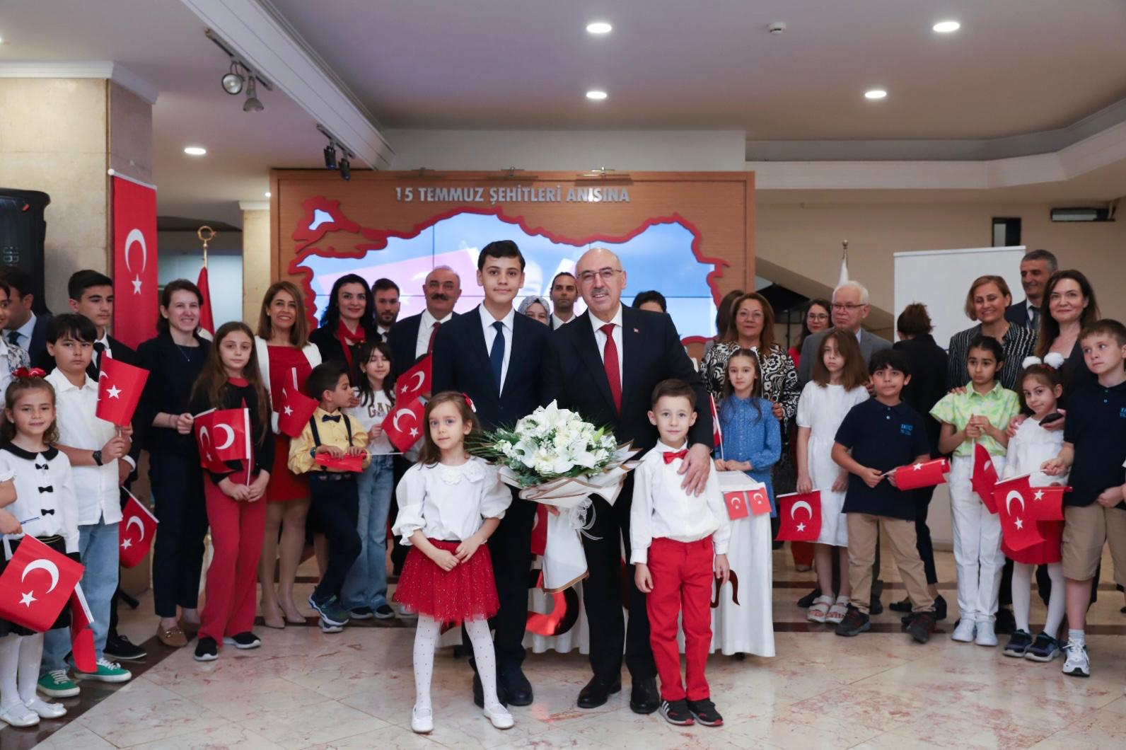 DEÜ 75. Yıl Eğitim Kurumları 7’nci sınıf öğrencisi Ali Topuzkanamış, toplantıda günün anlam ve önemine yönelik gerçekleştirdiği konuşmasında, TBMM’nin açılışının 104’üncü yılında da ilk günkü coşku ve heyecan ile kutlandığına vurgu yaptı. Topuzkanamış, “Bundan 104 yıl önce bugün, ülkemiz demokrasi ve Cumhuriyet tarihinin en önemli adımı olan Türkiye Büyük Millet Meclisi açıldı. Gazi Mustafa Kemal Atatürk ve Cumhuriyetimizin kurucu kadroları, bu tarihten itibaren demokratik bir ülke ve devlet inşa etmek için büyük çabalar ortaya koydular. Hepsini saygı ve minnetle anıyoruz. 23 Nisan sadece ülkemiz için değil; bütün dünya çocukları için bir kardeşlik ve barış vesilesi olsun. Dünyanın tüm çocukları için eğitim, güvenlik ve sağlık gibi en temel haklarının sağlandığı ve onların da mutlu olduğu bir dünya istiyoruz. Dokuz Eylül Üniversitesi olarak, bu konuda her türlü çabayı ortaya koyduk ve bunun için topluma katkı sunmaya da değerli hocalarımız, öğrencilerimiz ve tüm personelimiz ile birlikte devam edeceğiz” dedi.