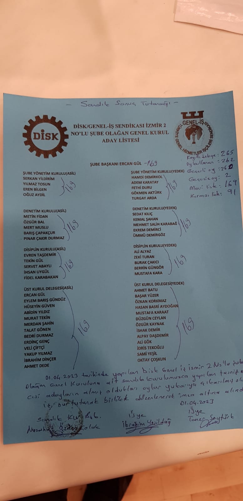 01.0.2023 günü gerçekleşen olağan genel kurulda 265 kayıtlı delegenin 262'si oy kullandı. 260 oyun geçerli sayıldığı seçimde mavi listenin başkan adayı Ercan Gül'e 170 oy çıkarken Arif Yıldız 90 oyda kaldı. Tutulan tutanağın üstüne DİSK 2 No'lu şube yönetiminin yeni başkanı Ercan Gül oldu.
