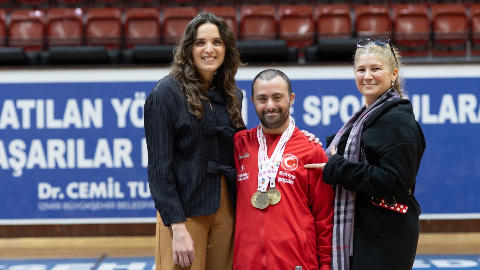 İzmir Büyükşehir Belediyesi Spor Kulübü’nün down sendromlu sporcuları Selin Durgut (23) ve Alper Öztürk (33) için kulüp yöneticileri tarafından özel bir tören düzenlendi. Kulüp Başkan Vekili Tuğçe Gülcüler, İzmir Büyükşehir Belediyesi Spor Kulübü olarak tüm yetenekli çocuklara imkân tanımayı amaçladıklarını belirterek “Bugün çok özel bir gün. Sevgiye doyduk. Alper ve Selin ile olmak bana umut ve sevgi verdi. Saf sevgiyi hissedebildiğimiz fazla an yaşamıyoruz. Bu anları yaşadığım için kendimi çok şanslı hissediyorum. İzmir Büyükşehir Belediyesi’nin sporcuları olması da bizim için ayrı mutluluk ve gurur meselesi” ifadelerini kullandı.