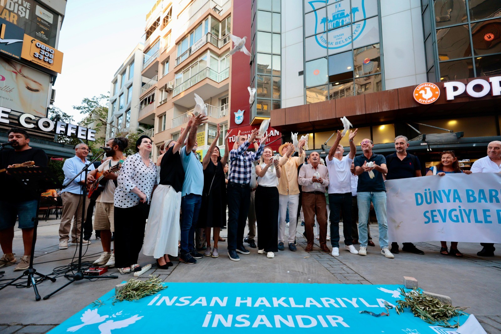 İzmir Müzisyenler Derneği’nin ezgileriyle katkıda bulunduğu etkinlikte barışın simgesi olan beyaz güvercinler aynı anda gökyüzüne uçuruldu.