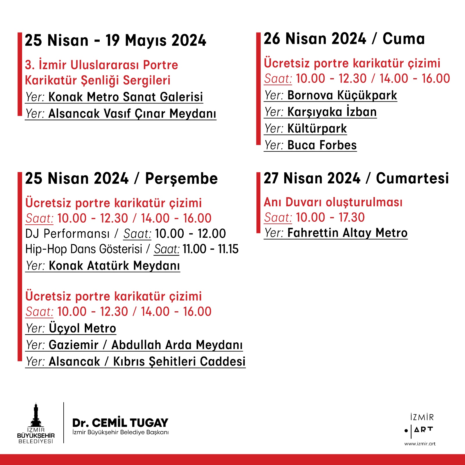 Şenlik kapsamında sanatçıların eserlerinden oluşan sergiler 25 Nisan-19 Mayıs tarihlerinde Alsancak Vasıf Çınar Meydanı ve Konak Metro Sanat Galerisi’nde sanatseverler ile buluşacak. 25 ve 26 Nisan’da şehrin birçok noktasında kurulan etkinlik alanlarında ücretsiz yüzlerce karikatür çizilirken, tüm sanatçılar 27 Nisan’da birbirinden eğlenceli çizimlerden oluşan anı duvarı oluşturmak için Fahrettin Altay Metro İstasyonu’nda buluşacak. 3. İzmir Uluslararası Portre Karikatür Şenliği’nin detaylı programına kultursanat.izmir.bel.tr adresinden ulaşılabilir.