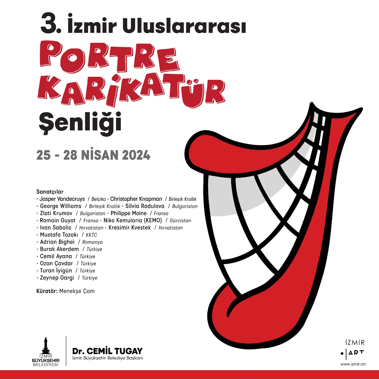 Bu yıl üçüncüsü düzenlenecek İzmir Uluslararası Portre Karikatür Şenliği, 25-28 Nisan tarihlerinde 9 ülkeden 17 sanatçıyı ağırlıyor. Küratörlüğünü Menekşe Çam’ın üstlendiği şenliğe Belçika’dan Jasper Vandecruys, Birleşik Krallık’tan Christopher Knapman ve George Williams, Bulgaristan’dan Silvia Radulova ve Zlati Krumov, Fransa’dan Philippe Moine ve Romain Guyot, Gürcistan’dan Niko Kemularia (KEMO), Hırvatistan’dan Ivan Sabolic ve Kresimir Kvestek, KKTC’den Mustafa Tozakı, Romanya’dan Adrian Bighei, Türkiye’den Burak Akerdem, Cemil Ayana, Turan İyigün ve Zeynep Gargi katılacak.