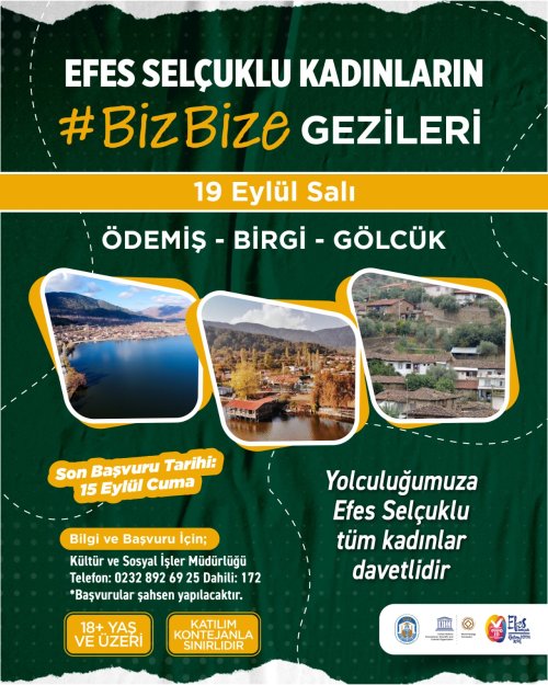 Efes Selçuklu kadınların Biz Bize Gezileri, tüm heyecanıyla devam ediyor. Kadınların bu seferki gezi durağı, Ödemiş olacak. 19 eylül salı günü gerçekleştirilecek gezi için son başvuru tarihi 15 eylül. Kontenjanın sınırlı olduğu gezide 18 yaş sınırı bulunmakta.