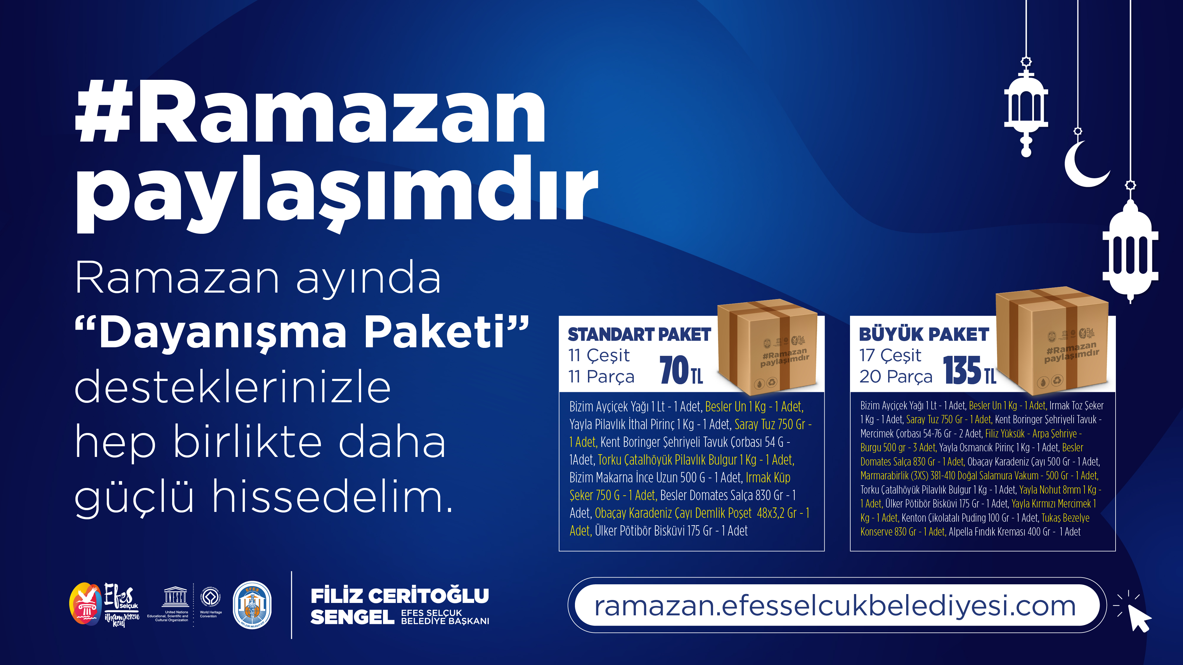 Ramazan ayı boyunca ihtiyaç sahibi yurttaşların beslenme ihtiyaçlarının karşılanmasına yönelik Ramazan Dayanışma Paketi projesi ile dayanışma yardımı yapmak isteyen yurttaşların Ramazan Dayanışma Paketi destekleri Efes Selçuk Belediyesi tarafından ihtiyaç sahibi yurttaşlara düzenli olarak ulaştırılacak.