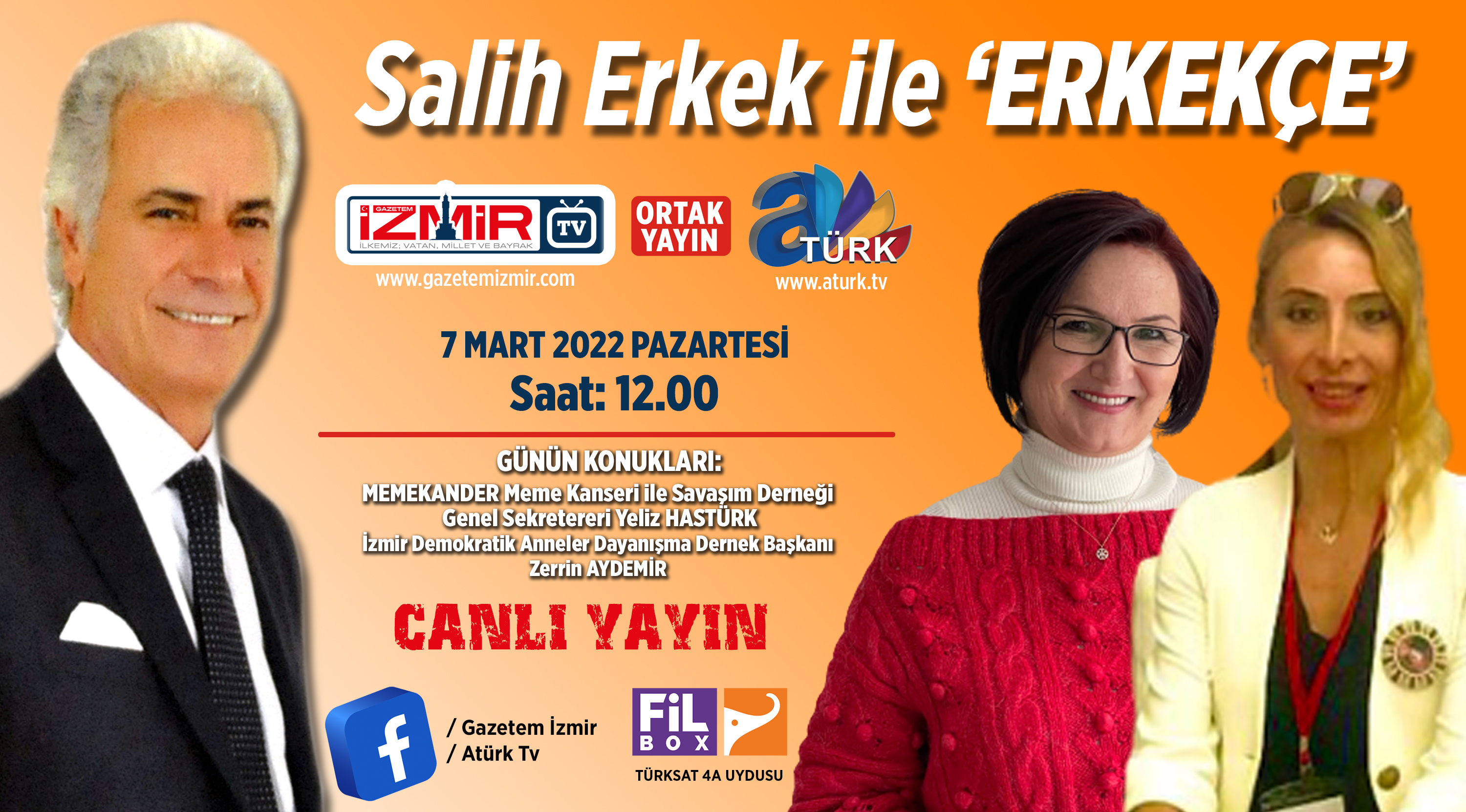 Yapımcılığını ve sunuculuğunu Salih Erkek'in üstlendiği Erkekçe programının 7 Mart 2022 Pazartesi (BUGÜN) canlı yayınlanacak bölümünün konuğu İzmir Demokratik Anneler Dayanışma Dernek Başkanı Zerrin Aydemir ve MEMEKANDER Meme Kanseri ile Savaşım Derneği Genel Sekreteri Yeliz Hastürk olacak.