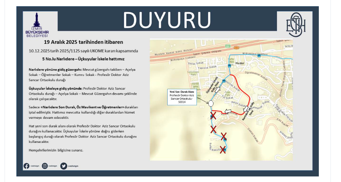 İzmir Büyükşehir Belediyesi ESHOT Genel Müdürlüğü tarafından gerçekleştirilen duyuruda şu ifadeler yer aldı: “ 19 Aralık 2025 tarihinden 5 No.lu Narlıdere - Üçkuyular İskele hattımız Narlıdere yönüne gidiş güzergahı: Mevcut güzergahı takiben - Açelya Sokak - Öğretmenler Sokak - Kumru Sokak - Profesör Doktor Aziz Sancar Ortaokulu durağı