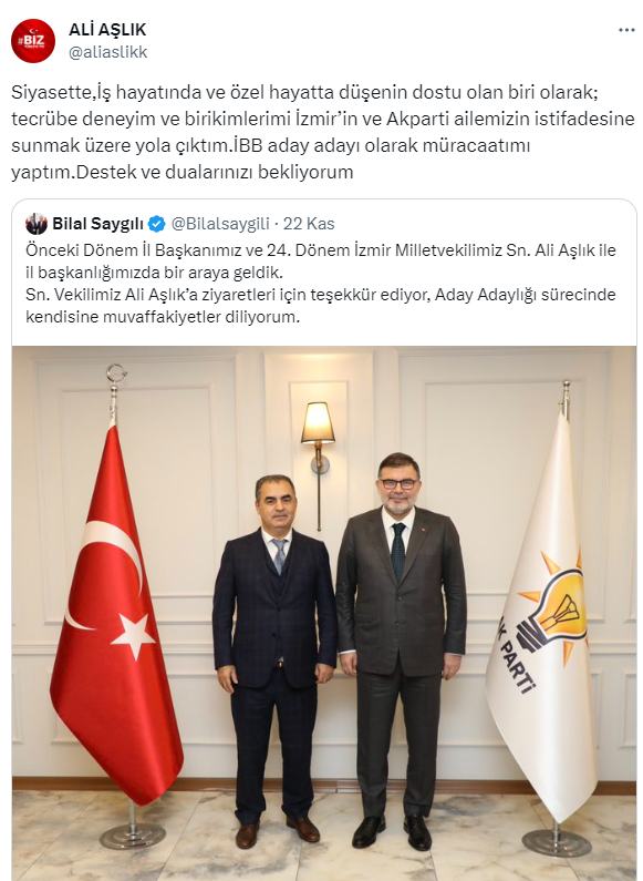 Aşlık'ın, başvuru sonrası AK Parti İzmir İl Başkanı Bilal Saygılı ile görüşmesini ise Bilal Saygılı kişisel sosyal medya hesabından resim paylaşımı yaparak ve şu ifadelere yer vererek duyurdu: