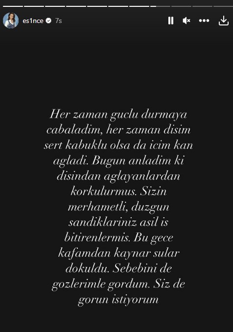 "Bedenim o kadar küçüldü ki kalbim içeride eziliyor. Gözüme bir damla uyku girmedi. Hiçbir şey bilmiyormuşuz meğerse. Ulu orta yapılan ihanetin sessizce acısını çekecek kadar asil değilim, isterseniz beni yargılayın. Saatlerdir yatakta felç olmuş gibi 20-20 saniyelik videoları başa alıp alıp izliyorum. Gizli saklı yapmak bir yana dursun, göz göze dudak dudağa şarkılar söyleyecek kadar aşağılaşmış. Bir yanda evli bir adamın bardaki eğlencesi kız diğer yanda boşanma süreci tamamlanmamış eşim. Ben ne yapayım siz söyleyin."