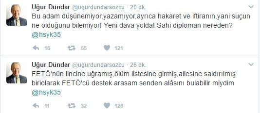 Dündar ise “Bu adam düşünemiyor,yazamıyor,ayrıca hakaret ve iftiranın,yani suçun ne olduğunu bilemiyor! Yeni dava yolda! Sahi diploman nereden?” yanıtı verdi.