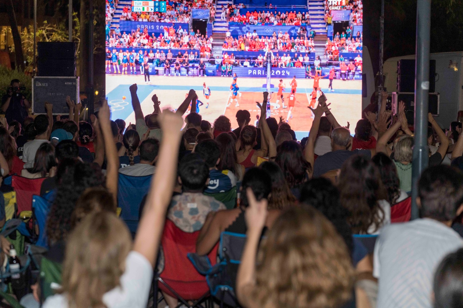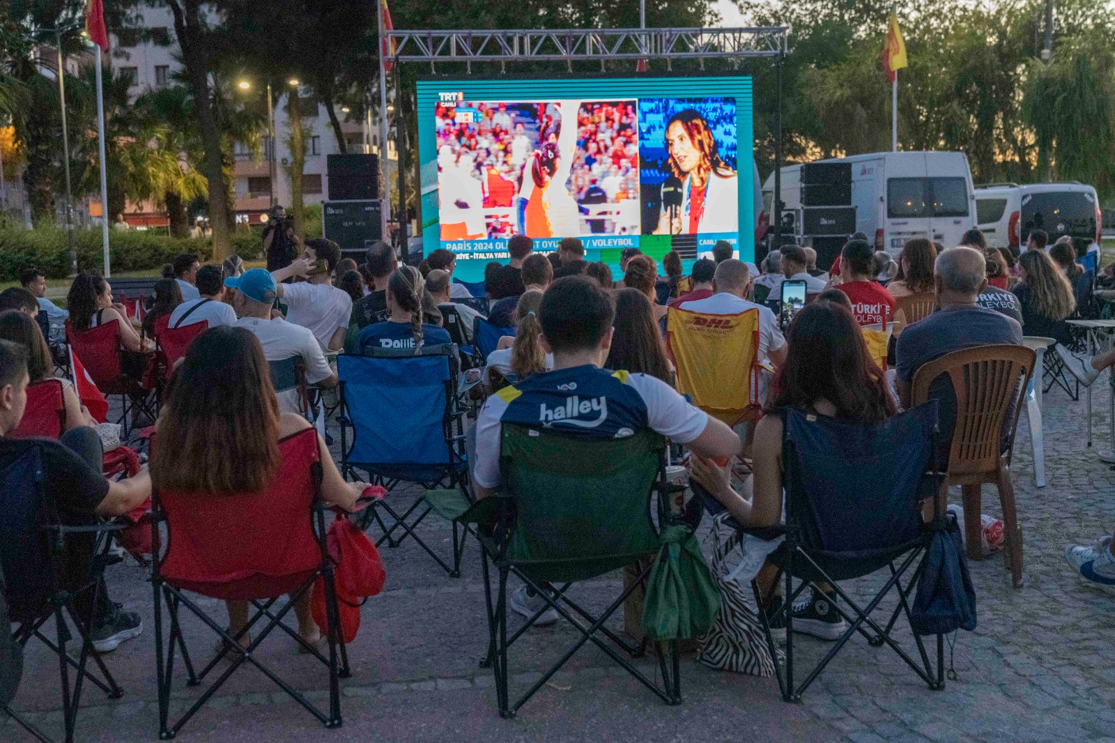 Paris 2024 Olimpiyat Oyunları’nda yarı finale kalan Türkiye A Milli Kadın Voleybol Takımı İtalya ile karşı karşıya geldi. Paris'te bulunan South Paris Arena'da düzenlenen karşılaşmada maç saati yaklaştıkça İzmirliler, Göztepe Paten Pisti, Bostanlı Yasemin Kafe önü ve Alsancak Gündoğdu Meydanı’na kurulan dev ekranların önünde yerini aldı. Her yaştan İzmirli milli takımın İtalya karşısındaki mücadelesini heyecanla takip ederken, tezahüratlarla milli takıma destek verdi.