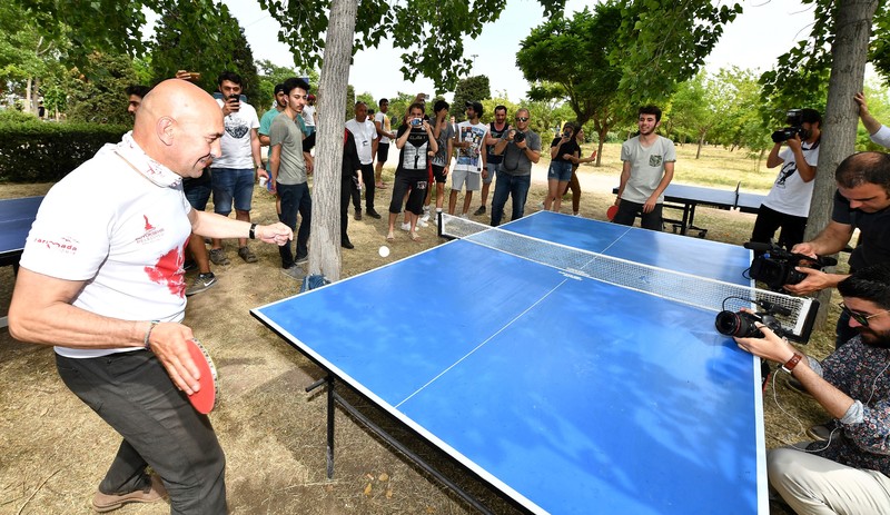 Kamp alanında müzik eşliğinde eğlenen gençlerr Başkan Tunç Soyer'in aralarına katılmasıyla önce "Çav Bella" şarkısını söyledi, ardından hep birlikte İzmir Marşı'nı seslendirdi. Soyer de gençlerin çağrısına uydu ve onlarla birlikte şarkılara eşlik etti. Sportif kimliğiyle öne çıkan Başkan Soyer, davet üzerine masa tenisi oynayarak bu alanda da iddialı olduğunu kanıtladı.